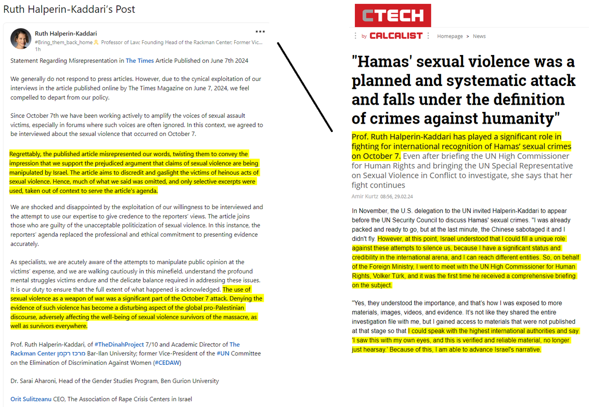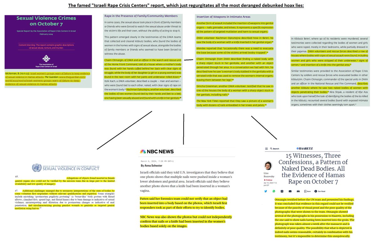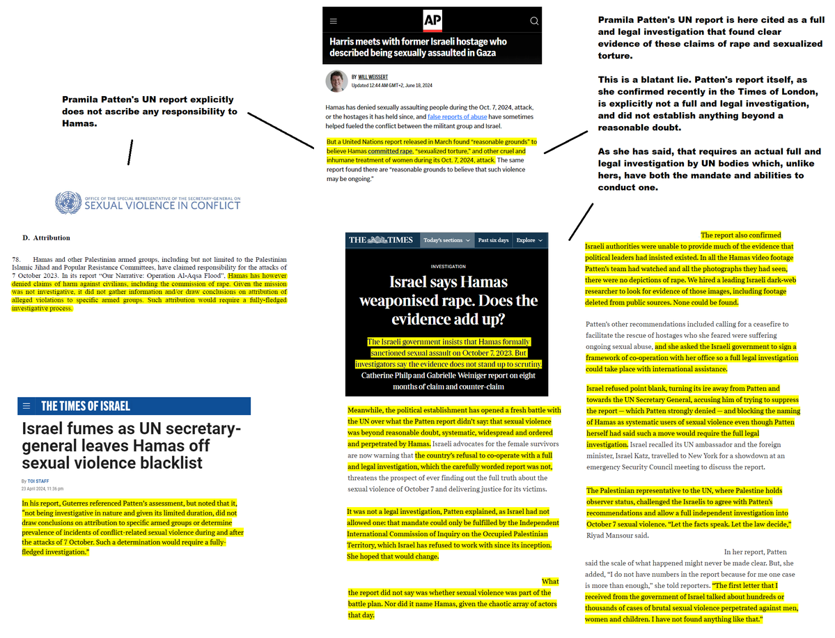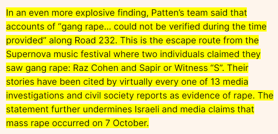 this is the crucial part that many have overlooked, regarding the deranged claims of "gang rape" from Sapir and Raz Cohen, repeated in the New York Times and other Western media. We already knew they lied from other evidence, but Patten's UN report also debunked it: