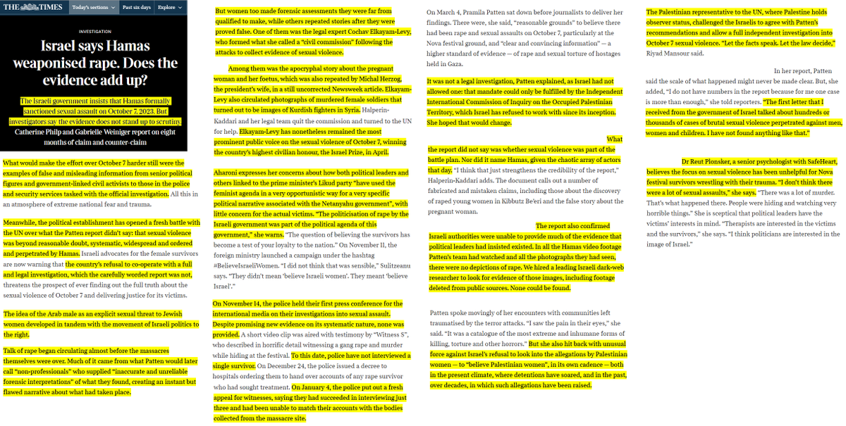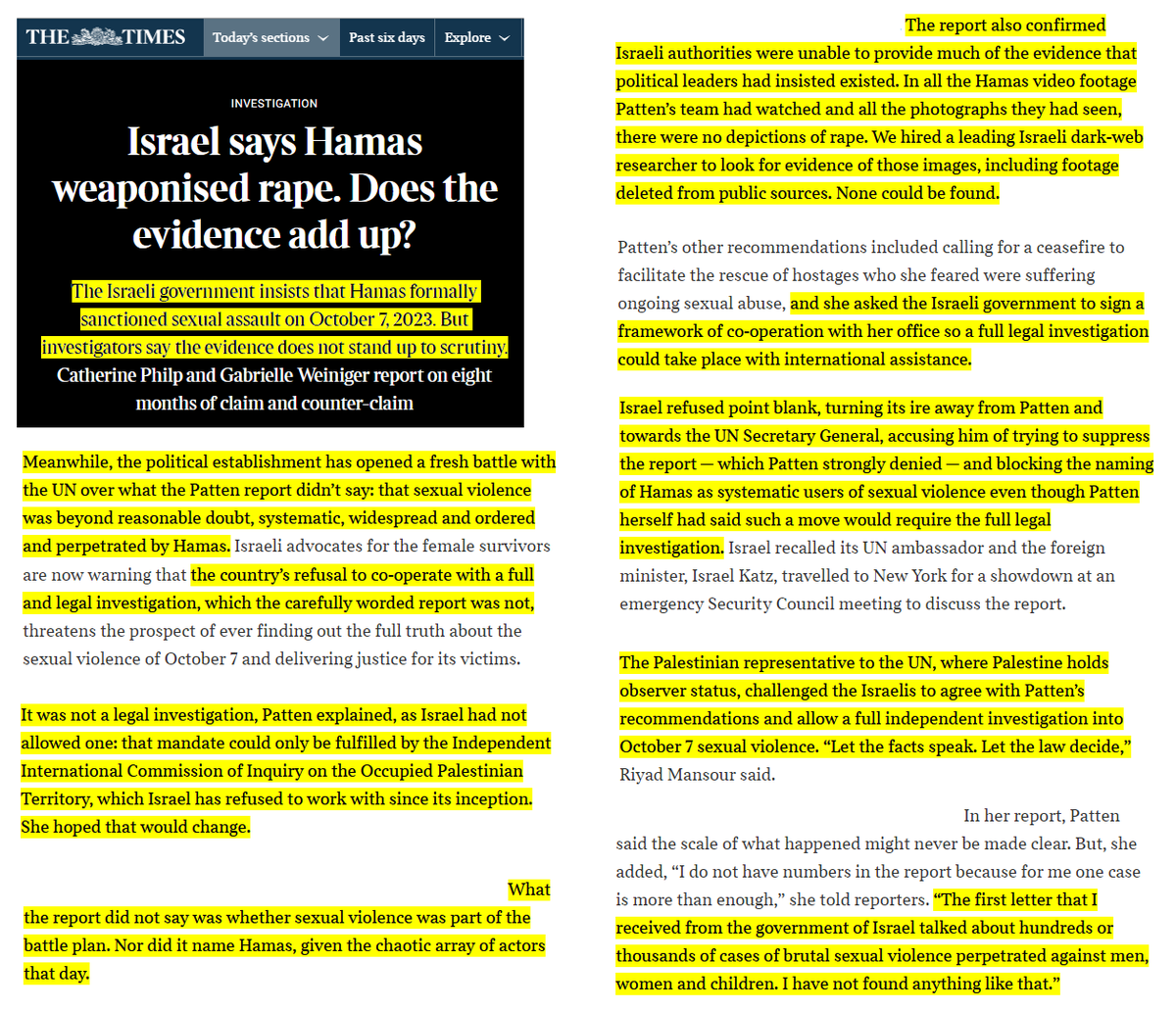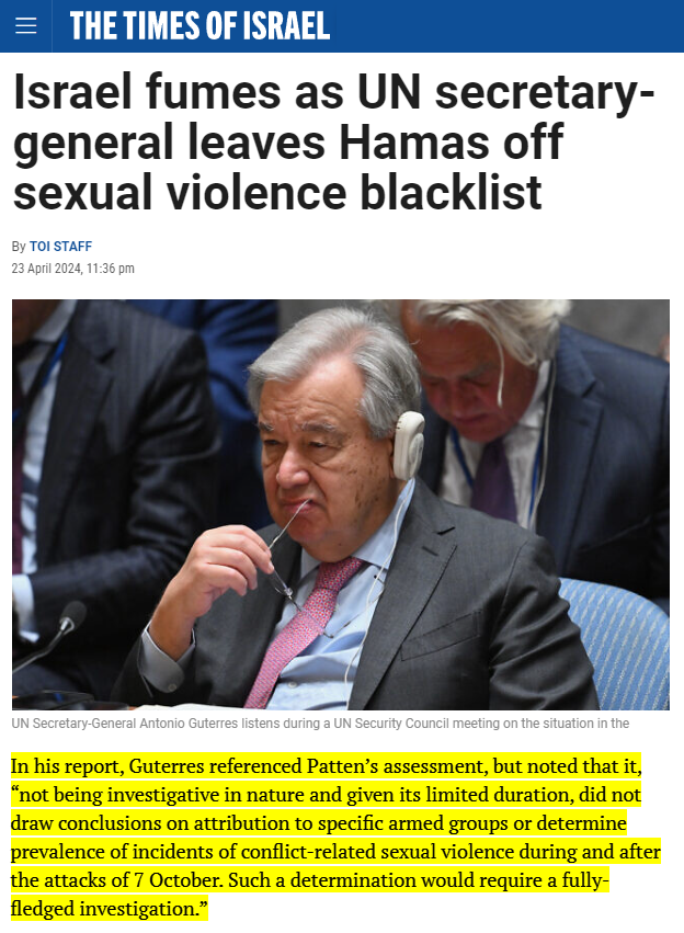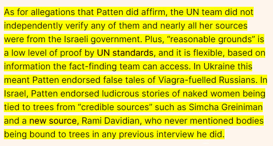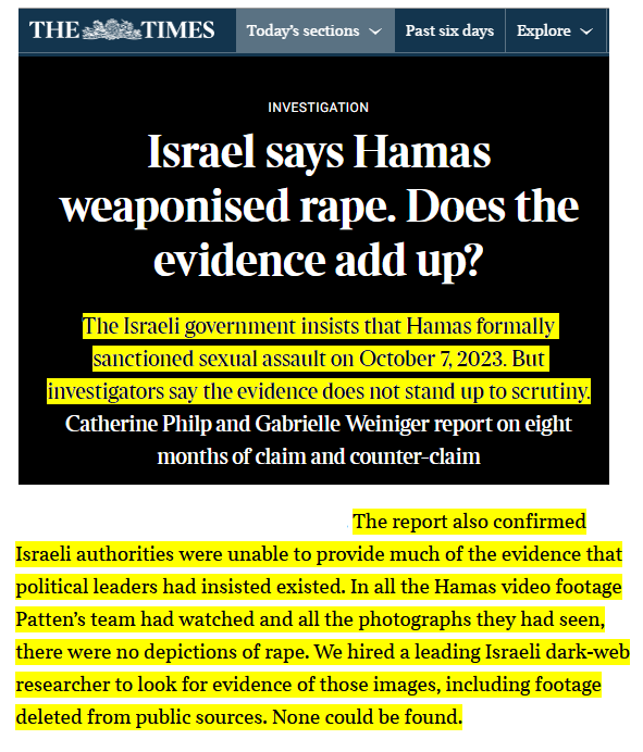 this piece by The Times is the first one I have seen in prestige Western media that accurately states both the highly limited nature, scope and content of Pramila Patten's UN report, which every other outlet keeps lying about, falsely saying it "confirms Hamas mass rape", and "found evidence of sexual violence/rape" by the evidentiary standard of an actual full legal investigation, both of which Patten herself confirms again are lies and falsehoods but the NYT, BBC, Reuters and AP keep repeating to launder their own "mass rape" hoax (see https://t.co/KLkQINAOGV and https://t.co/DXthLAiyW8). The AP just did this again recently in its report exposing the two Zaka hoaxers by constantly, over and over again, repeating these blatant lies about Patten's UN report "confirming Hamas mass rape" and "sexual violence/rape on October 7." But now the Times confirms that Patten's report was not full, legal or investigative in nature, that she explicitly does not attribute any sexual violence/rape to Hamas, and that any case of sexual violence she says might have happened on October 7 is based on a low evidentiary threshold that does not meet the standard of an actual full legal investigation, and relies entirely on Israeli information and "eyewitnesses" like the aforementioned Sapir. That is why she keeps calling for an actual investigation, which as the Times notes the Israeli regime keeps blocking. I have been saying all this for months now (see https://t.co/1LCeFrhqWE), and finally it has penetrated a mainstream prestige Western media outlet, confirming that all the others in the Western media and political class including the NYT, BBC and Guardian are blatant propagandist liars.