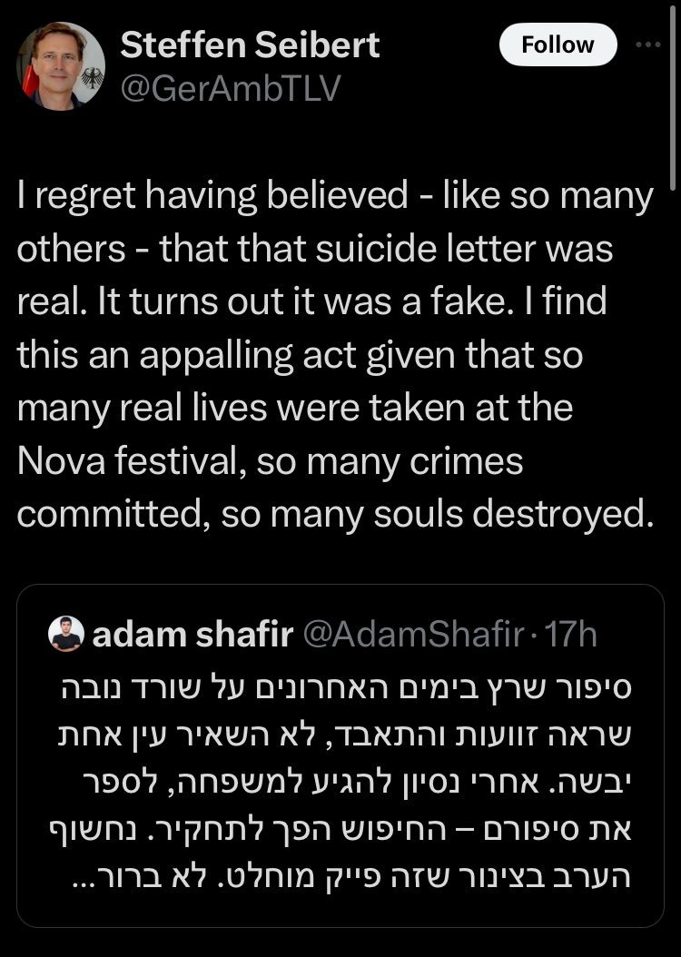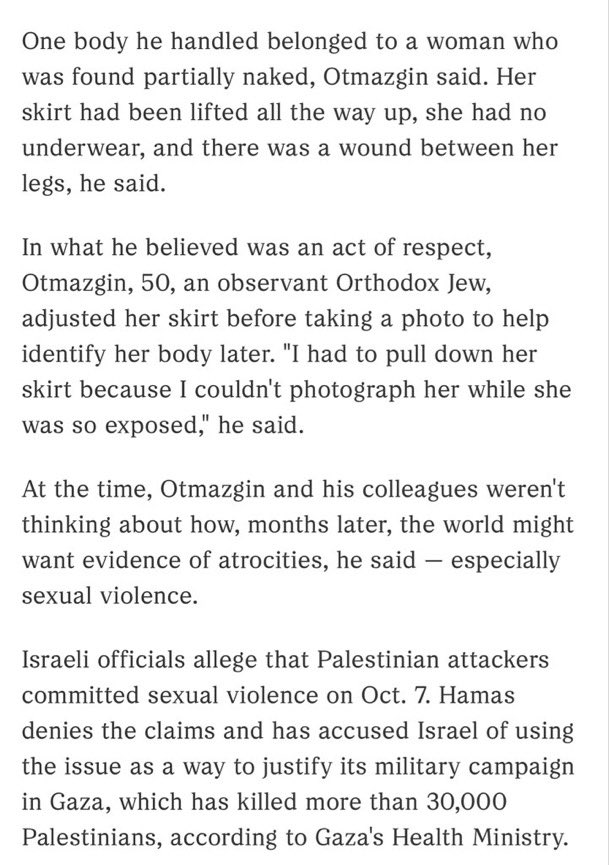 if you have journalistic integrity @FrankelJulia @tgoldenberg, you will correct these glaring errors and outright falsehoods in your reporting, and ensure your AP colleagues will also no longer repeat them. Again, Otmazgin's photos were proven to not show what he claims they show by NBC News, the UN and Haaretz who all reviewed them. Otmazgin is also a proven pathological liar and huckster with a long history of deceit and grifting, and did the same in his position as senior commander for Zaka not just to further the Gaza genocide with his atrocity propaganda, but also to ensure donations would be given to Zaka and himself based on these lies, as Haaretz has reported on (see https://t.co/2YeuQPXqyW). And also accurately report the actual scope, nature and conclusions of Patten's UN report, namely that it was not a full and legal investigation, did not establish any rape/sexual violence beyond reasonable doubt, and did not ascribe any rape/sexual violence to Hamas. Again, she herself reiterated all this in the Times of London just recently: https://t.co/SySqt8VvLN Then also add that the recent UN report by the actual UN body with an investigative mandate concluded they could find no proof of any rape, sexualized torture or genital mutilation on October 7, whereas they did conclude that Israel is responsible for actual systematic and planned mass rape, sexualized torture and violence against Palestinian children, women and men, both since October 7 and long before: https://t.co/itZJr0tP1h https://t.co/aSkgaphPQ5