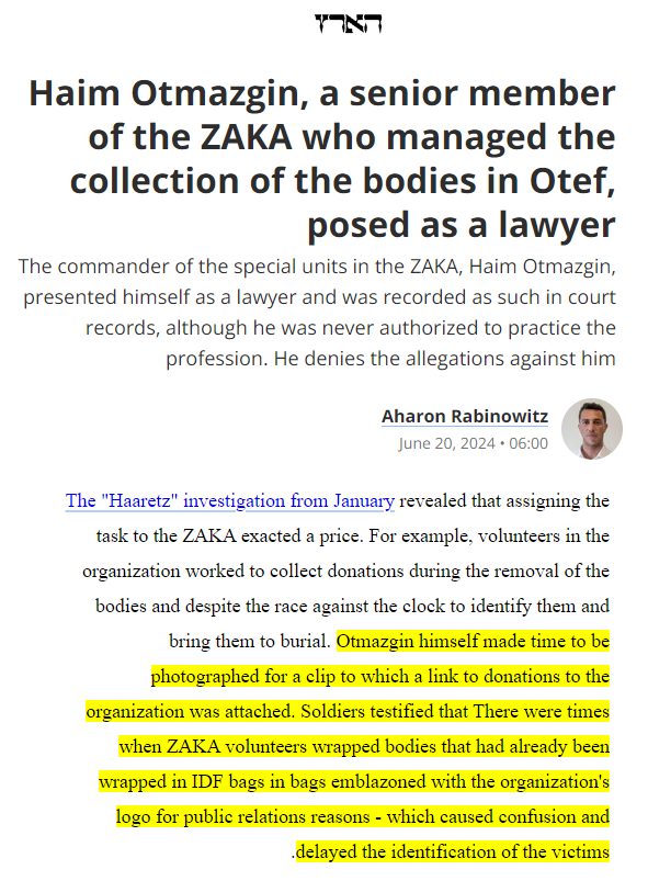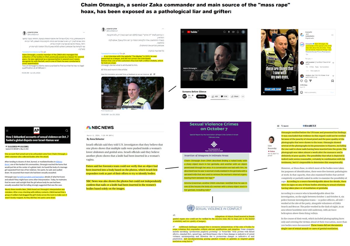 BREAKING: The "mass rape" hoax collapses even further. Chaim Otmazgin, a senior Zaka cult commander which is the main source of the "mass rape" and other genocidal propaganda hoaxes, and who is himself a star witness in the Sheryl Sandberg documentary, has just been further exposed as a pathological grifter by Israeli media. For years he falsely claimed to be a lawyer to scam clients out of money, with one client being scammed out of half a million shekels (over $400,000). This depraved scumbag has been touring around the world on behalf of the Israeli regime with his rape hoax lies, and again is prominently featured in the Sandberg hoax documentary, recently screened at the White House by Kamala Harris (see https://x.com/zei_squirrel/status/1802462391445184651). His lies are also prominently included in the "Israeli Rape Crisis Center" report, which continues to be cited as a credible source as it just gathers together all the deranged and debunked hoax lies from the Western media (see https://x.com/zei_squirrel/status/1782081395374121306). In that report and elsewhere, Otmazgin lies about personally seeing and having photos of "bodies with nails and knives in their vagina". This was debunked by NBC News, Haaretz and the UN, who saw the same photos and said he lied. Then the AP debunked a lie of his about a body of a teenage girl he saw with her pants pulled down as evidence of rape. The body had been moved by Israeli troops and the pants were pulled down because of that. Will they now add corrections and retract their pieces relying on this proven fraud huckster grifter's deranged propaganda lies? Of course not. Only Israeli media is allowed to expose him for what he is for their domestic audience. For the Western media class he is still a Credible Serous Source. Even the AP in the piece debunking that rape hoax lie of his desperately defends his credibility, and says he just made an honest mistake because he was "traumatized". These depraved scum have no shame.