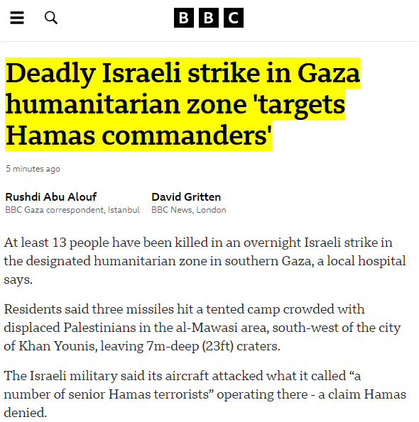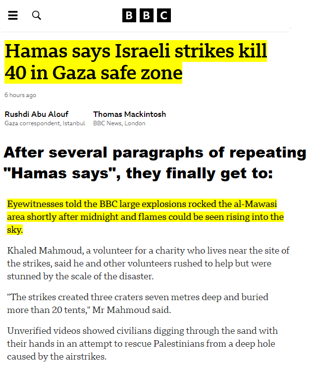 the BBC remains the most odious genocidal propaganda rag. The headline is "Hamas says", then buried in the article they admit "oh btw there is also video showing it and eyewitnesses from charities and others". They have been doing this genocide-laundering for nearly a year now https://t.co/Bb9tDB7isX