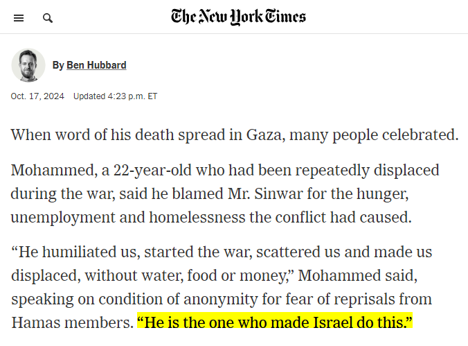 this is just astonishing. The New York Times just published a piece where they say "many in Gaza" celebrated Sinwar's killing, and cite a fake anonymous person supposedly saying "he made Israel do this to us." This is like publishing in 1944: "A Jew in Auschwitz, who wants to remain anonymous for fear of being killed by his fellow inmates, celebrated the crushing of the Warsaw uprising, saying those evil communist Jews made the Nazis do this to us." This is actually what Der Sturmer published, and the New York Times is now doing it today with utter glee as the entire media class celebrates Ben Hubbard for his brave heroic "investigative reporting". It's utterly insane. This the level of genocidal murderous depravity that the New York Times and the entire Western media class gleefully indulges in on a daily basis. And they think they are the paragons of moral virtue as they do this. Finding some fake anonymous random guy in Gaza amidst a genocide and going "tell us how Sinwar made Israel do this to you, tell us, I will make sure it's front page news in the New York Times." Ben Hubbard is one of the sickest most vile genocidal scum alive. He is the modern day Goebbels.