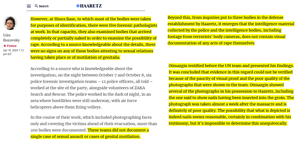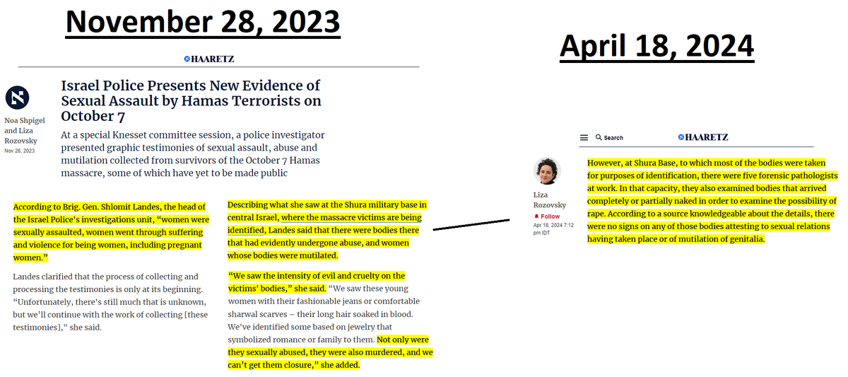 this is also very important: The Times investigation does not mention two other crucially important facts that we know from a recent Haaretz investigation, namely that there is zero physical evidence of sexual violence/rape on any of the October 7 bodies that were brought to the Shura base for investigation by forensic pathologists, and also those found at the Nova festival. Now this already completely destroyed the New York Times, BBC, CNN, Reuters and AP articles on the "mass rape" hoax as they all cited specifically targeted systematic sexual violence and rape on bodies which they claim they verified in photos and from witnesses at the Shura base (see https://t.co/w7TL50dL7M and https://t.co/oHZms6STsc). They lied. They outright lied, and the AP in its recent piece debunking the two Zaka hoaxers also repeated this lie (see https://t.co/PGhllyKn4P). This is why The Times piece is important, because the Haaretz piece despite including the aforementioned two important facts still desperately tries to defend the hoax by relying on falsehoods that the Times piece exposes and debunks, namely by citing the forced tortured "confessions" as evidence, by blatantly lying about the Patten report "confirming Hamas mass rape" and being a "full legal investigation" which again The Times just disproved, and also lying about both the number of "witnesses" and their credibility, including of the now exposed and debunked by The Times "Sapir". Now all of this is of course intentional. In every piece admitting that a core element of the "mass rape" hoax was fake, they have to still cling on to another part of it. So it is up to people like me to read them all carefully and piece it together and show how despite their desperate attempts to salvage parts of the hoax, it's over. There is no thing to salvage. There is no evidence for any of it.