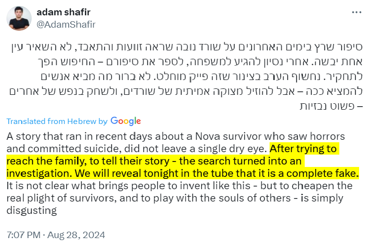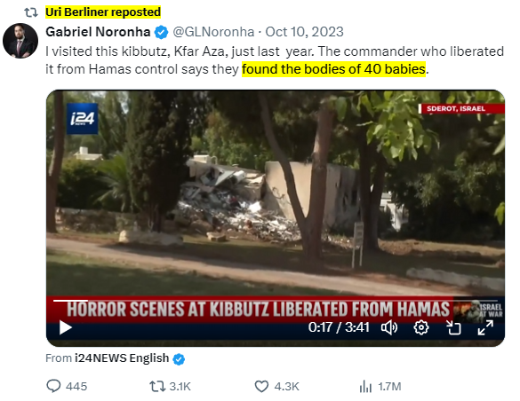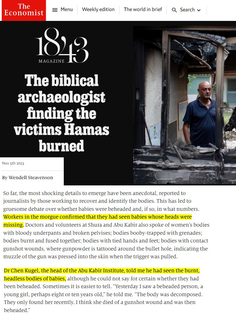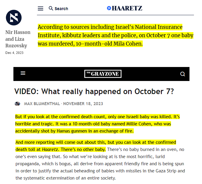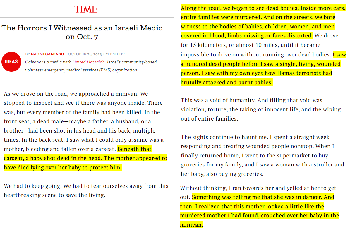 on October 26 Time Magazine published a piece by Naomi Galeano, an Israeli first responder who works for United Hatzalah, a religious fundamentalist grift cult like Zaka (of course she is laundered as a "medic" in the title and the piece itself). In that piece, which is in the top Google search results for October 7 first response, she describes in vivid dramatic detail how she went up to a van and saw a baby that was shot to death. She also describes seeing babies who had been "brutally attacked and burnt by Hamas terrorists." These babies never existed. She lied brazenly and shamelessly in the most absurd melodramatic style like she was writing a terrible movie script, and Time Magazine allowed her to lie brazenly and shamelessly on their front page, fabricating atrocity propaganda to launder the Gaza genocide that was in its initial stages. And it wasn't just Time. It was also CNN and NPR that gave her the floor to spread her deranged lies, including claiming that she personally saw beheaded babies. The article is still online at Time Magazine, with zero corrections.