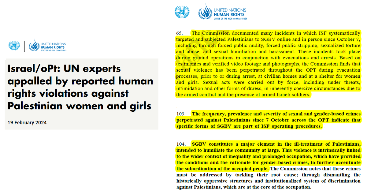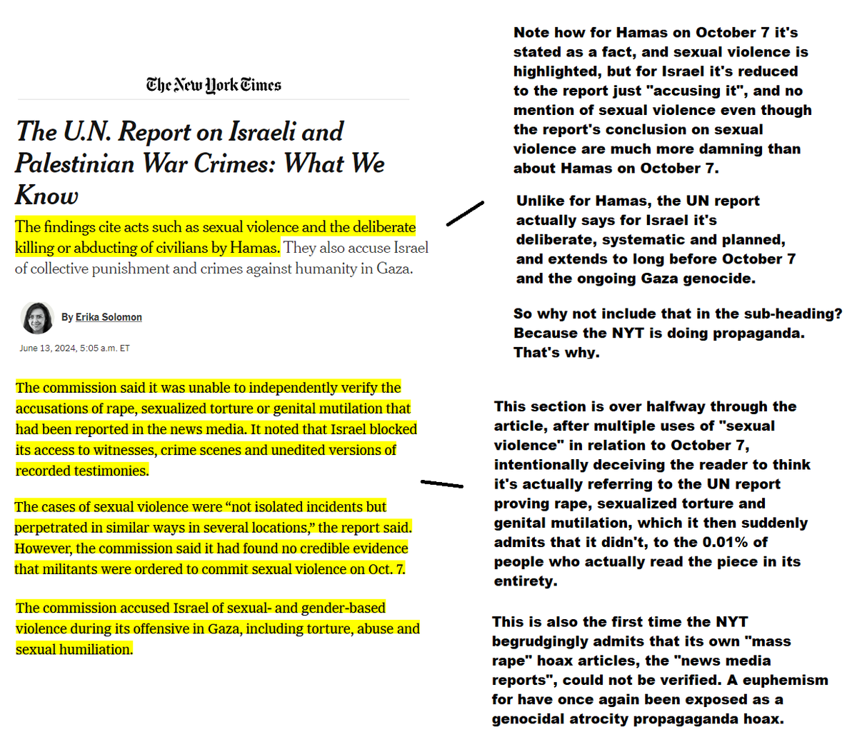 now what will the media class do with this first actual UN report? Let me predict it for you. If they report on its conclusions at all, they will lie and claim that the references to "sexual and gender violence" proves their "mass rape" hoax, when it explicitly debunks it in its only mention of rape. The use of "sexual violence" refers to any violence they believe was targeted against women, not referring to rape, sexualized torture or genital mutilation which it again explicitly only mentions once in paragraph 26 I highlighted. But here is the problem for them. If they go with that obviously and intentionally deceitful reading of the report's use of "sexual violence", then it means they also have to accept that it was not ordered by Hamas as a systematic weapon of war, which is what the NYT, BBC, Reuters, AP and Guardian falsely claimed, whereas in the Israeli regime case it is actually systematic, "part of their operating procedures." So the actual "mass rape" in that case would not be done by Hamas on October 7 as the New York Times and all the others claimed, but by their precious genocidal Israeli regime, and not just since in the ongoing Gaza genocide, but stretching back to the entire history of the occupation. But of course they will ignore the term's usage in that context, and simply lie about it to launder their genocidal mass rape hoax, exactly like they did with the Patten report which finally months later The Times of London came out as the first mainstream Western media publication to accurately report on while also confirming it with her directly. Now watch and see how accurate my prediction is. I know these scumbags in and out. I know exactly what they're right now writing and putting as their headlines to put on their frontpages: BREAKING, UN HUMAN RIGHTS COMMISSION FINDS MASS SEXUAL VIOLENCE ON OCTOBER 7. This is the lie they will all go with. Just watch.