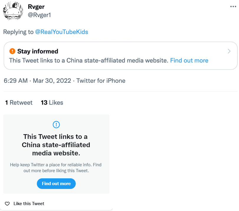 those media links are filtered out, you can't even see the title of articles, just a notice. Then when you click to like you get a second one: "Are you sure you want to like this tweet from Chinese state affiliated media?" But psy op outfits like Iran International operate freely https://t.co/PnKfRBi3zV