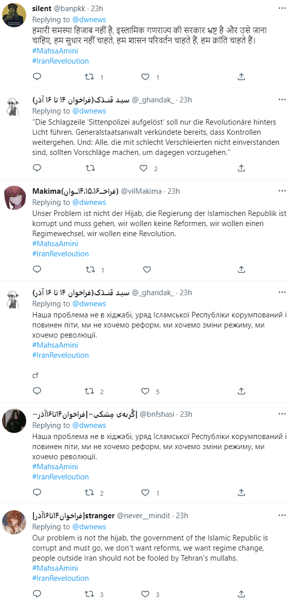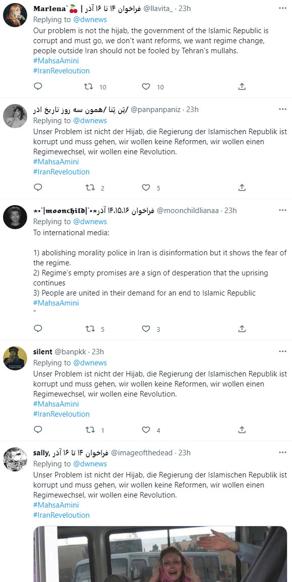 this is perfect. We get to see what happens when a bot army misfires. Yesterday the German outlet Deutsche Welle posted a clip completely unrelated to Iran, and someone mistakenly put an Iran focused bot army on it. Look at the replies. That's how you do psy op campaigns today https://t.co/nk3myUmiuL