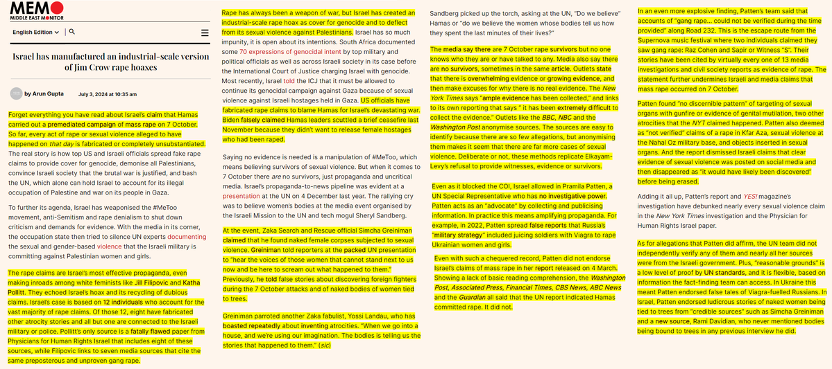 I highly recommend reading the full piece, which also goes into detail on the historical background of these genocidal propaganda hoaxes: https://www.middleeastmonitor.com/20240703-israel-has-manufactured-an-industrial-scale-version-of-jim-crow-rape-hoaxes/ And I highly recommend following its author, @arunindy, one of the most knowledgeable journalists covering the hoax