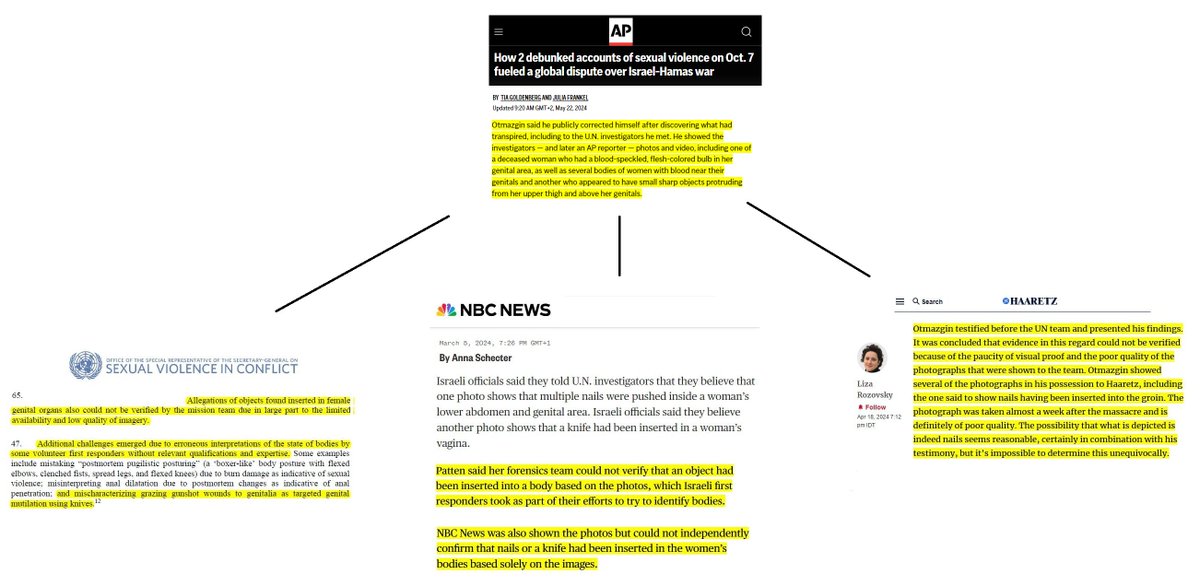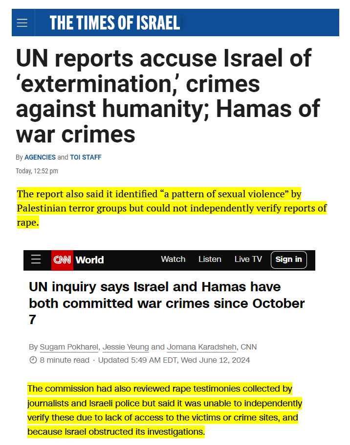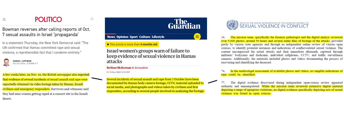 so now you have two UN reports, one by the UN's Human Rights Commission which has an actual investigative mandate, concluding there was no systematic Hamas-ordered campaign of mass rape/sexual violence. The NYT, Guardian, BBC, AP, Reuters: Will you retract your genocidal hoaxes? https://t.co/IMymWTTRKr