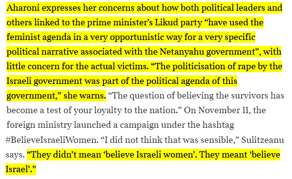 another important fact to highlight from the Times report is Israeli feminists admitting the Israeli regime has and continues to cynically weaponize the fabricated mass rape hoax to launder the ongoing Gaza genocide, and slogans like "Believe Israeli Women" are pure propaganda: https://t.co/qpPxEnOoln
