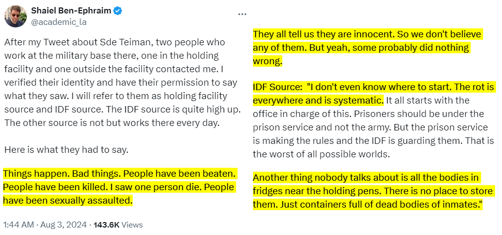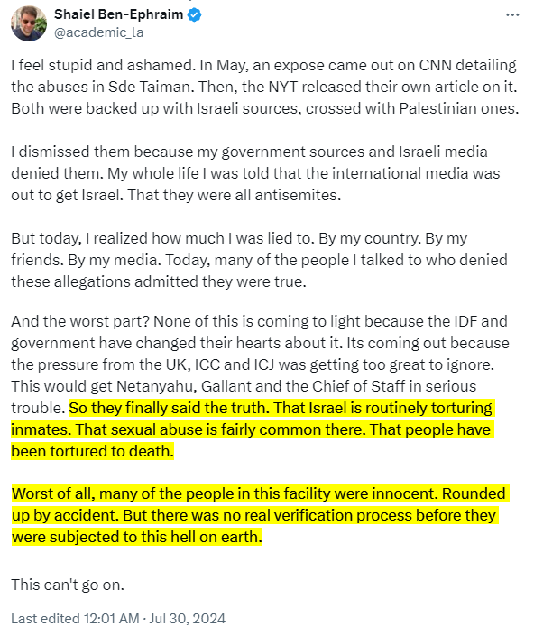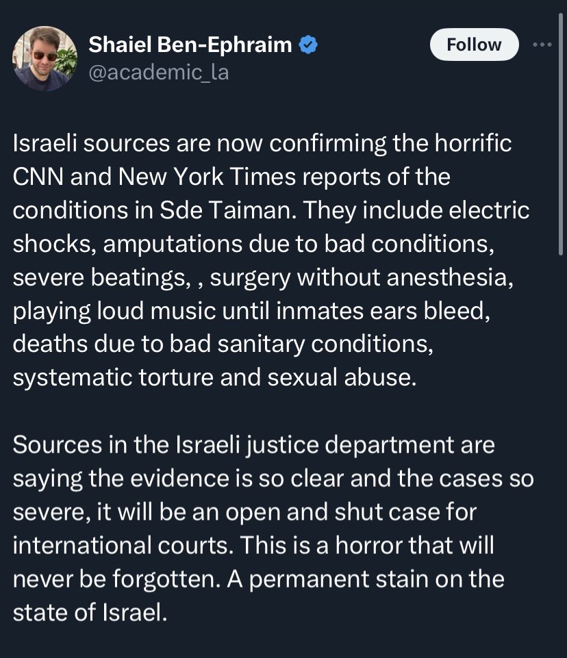 more from the same Zionist admitting the systematic torture and mass rape of innocent Palestinians, and also saying he knew about it for many months but is only publicly stating it now because they're desperately trying to do a PR laundering attempt: https://t.co/YrytCQCiUe https://t.co/naaiIgZRSi
