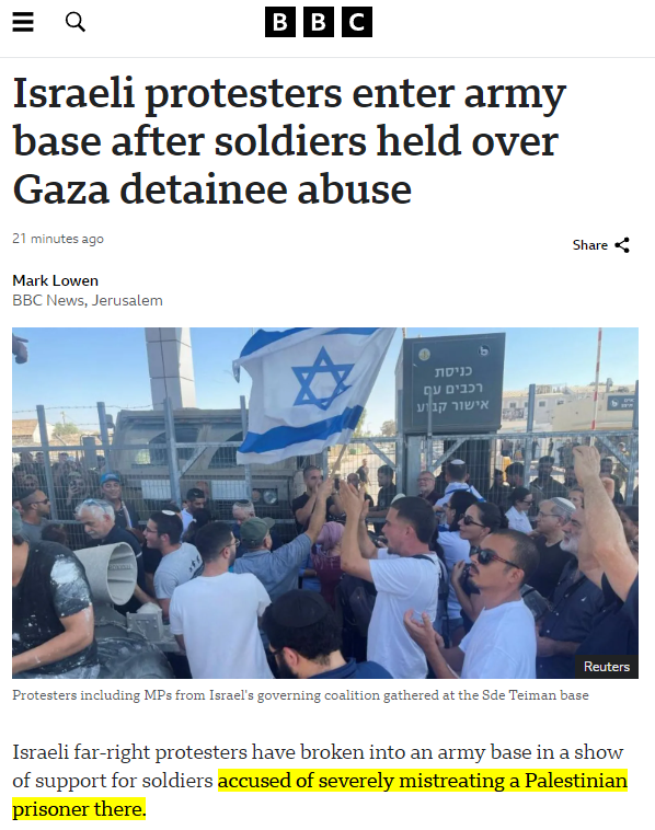 what happened here is clear: The Israeli regime was pressured by the ICC and ICJ cases against them, as well as the UK saying they would limit or ban arms sales. So they're now desperately doing a PR move to try to launder their actual systematic mass rape of innocent Palestinian babies, children, girls, boys, women and men by pretending it's just a few bad apples that they've now caught and have taken care of. This is all part of that PR campaign: OMG this is so bad and terrible! But it's just a few bad apples, we're taking care of it, we don't need the ICC, ICJ, don't block arms supplies, we're taking care of it, look we arrested a couple guys that we'll put in a luxury hotel for a few months until this goes away and then pretend the investigation is concluded and they're all innocent. That's the project they're working on now, but it's backfiring because their own fanatical deranged rape and death-cult Zionist population is going insane with rage that they even did the fake PR move of pretending they're trying to stop, and stormed this base and other places demanding they explicitly say that their right to mass rape Palestinian babies, children, boys, girls, women and men is Holy and Sacrosanct. This is what Israel is and has always been, as I've been saying all along. It's a genocidal depraved death and rape-cult, and every accusation of theirs is a confession: https://t.co/EQW3eEOkP3 https://t.co/k95G04H7nr https://t.co/ZzqpSW2xwU https://t.co/v9MNg7pNQN https://t.co/UUOdxFQsfS https://t.co/NwaJPJmeSg