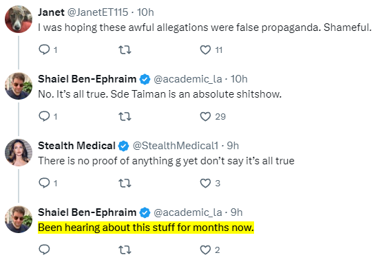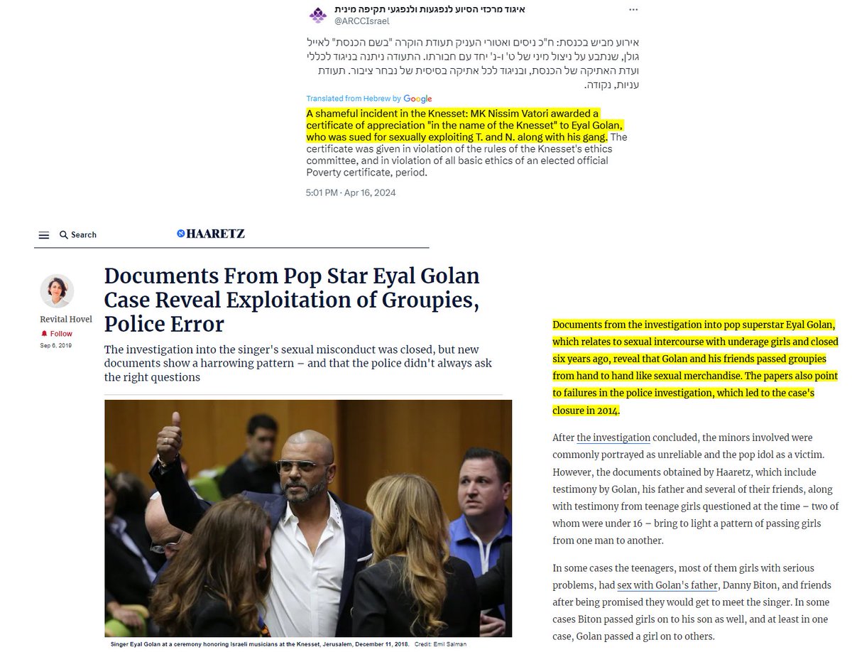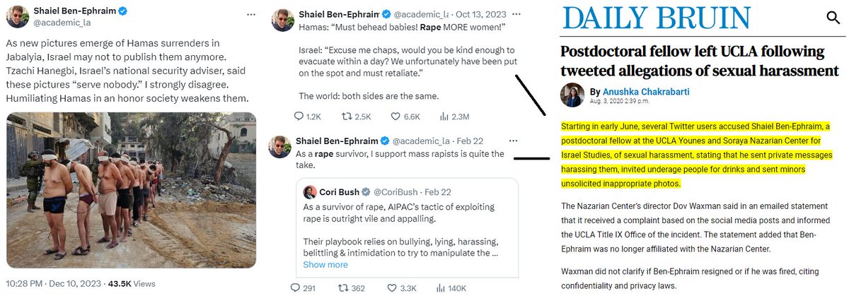 in the rest of their testimonies given to fanatical genocidal Zionist Shaiel Ben-Ephraim they desperately try to justify their rape-torturing to death of Palestinians by adding "yeah but some of them are Hamas and they raped our girlfriends!", just regurgitating the debunked genocidal mass rape atrocity propaganda hoax the Israeli regime and Western media and political class, including Kamala Harris, gleefully fabricated and spread (see https://t.co/tdmWqNMdk0). So they're using a debunked hoax to justify their actual systematic mass rape of Palestinians they know are innocent. And they're raping them to death. Also Shaiel Ben-Ephraim, who is now feigning outrage about the rape-torture-death camps his precious Israel is running with full support of the population, himself enabled all this by demanding and celebrating the mass arrest and torture of Palestinians, and fabricating and laundering the 40 beheaded babies and "mass rape" hoaxes that the actual baby beheaders and mass rapists are all using as their justification. And it gets even worse: Shaiel Ben-Ephraim is himself an actual pedophile rapist, who was expelled from UCLA for being a child predator. Literally every Zionist accusation is a confession.