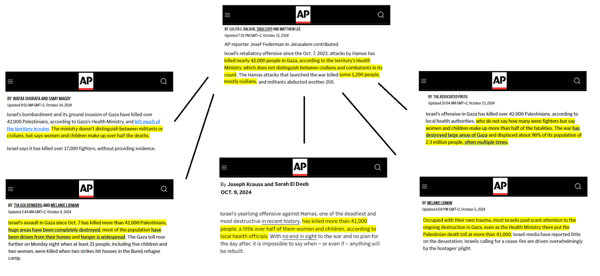 in their front page article today the AP has again used a depraved genocide-laundering script to erase the majority of civilians killed in the ongoing Gaza genocide, and pretend they're all evil Hamas. It is written by: @TaraCopp@lbaldor@APDiploWriter@joseffederman This violates the AP's own prior articles where they do not use this script, and make explicit that the majority of those killed are civilians, even though they still do their best to minimize it by saying "over half" and "the Ministry said", which is of course never stipulated for the "mostly civilians" designation for the Holy Saint 1200, which includes many killed by Israel itself in the Hannibal Directive as well as military and policy forces. Every single time I see the AP use this script again, I will post it here, include their accounts, and ask you all to tell them how you feel about their grotesque sickening genocide-laundering.