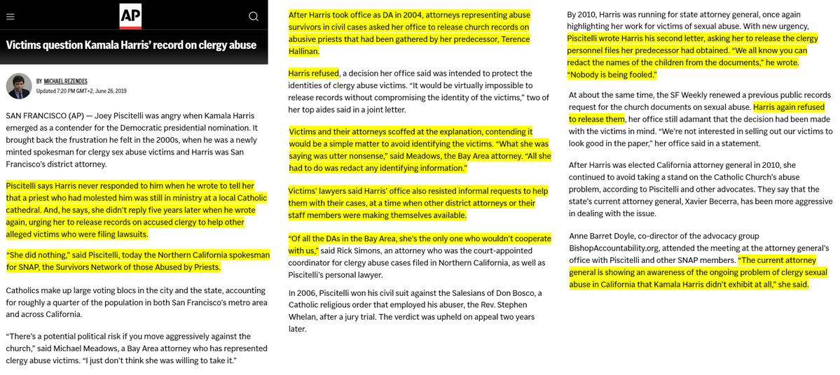 this is insane. Kamala Harris actively protected pedophile mass rapists to advance her political career, and Republicans aren't even mentioning it because they also don't want to offend the Catholic Church. So her shielding of pedophile mass rapists is being swept under the rug