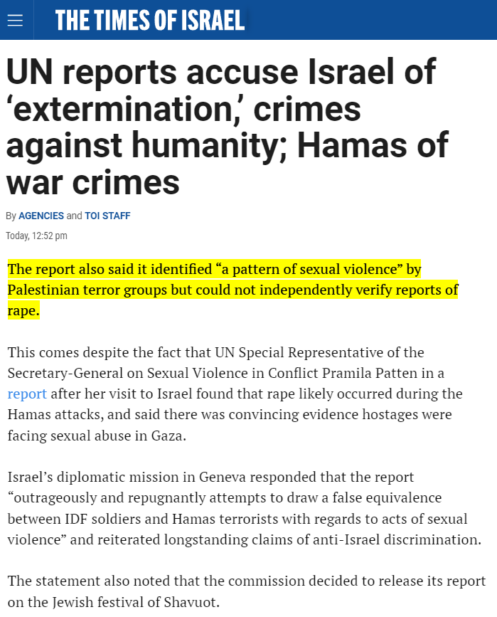 the Israeli regime and media are going insane. The Times of Israel propaganda rag admits: The UN report doesn't verify a single rape. Then they immediately deflect to Patten's report, and lie about its status which this actually investigative report supersedes per Patten herself https://t.co/1DpVU5KU6h