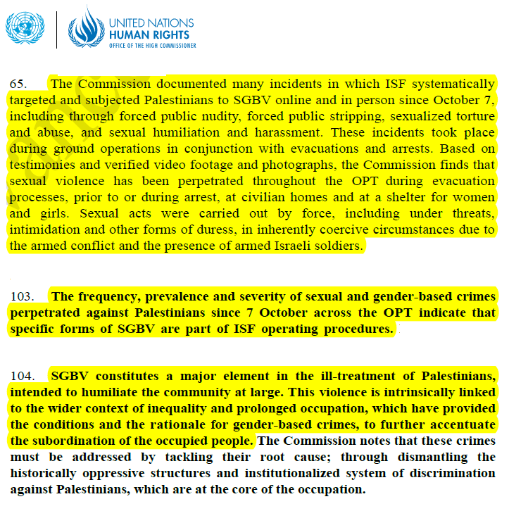 the investigation by the UN's Human Rights Office also concludes the Israeli regime does actually engage in a systematic campaign of sexual and gender violence against Palestinian children, women and men, rooted in the very nature of the occupation and can only end with it: https://t.co/Q5rTAnAIFj