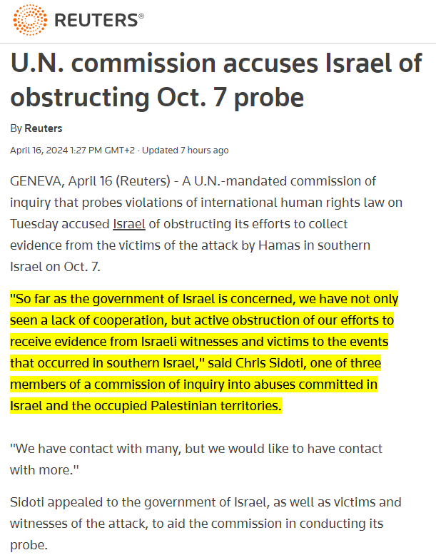 now you know why Israel blocks investigations by UN bodies that have an actual investigative mandate and abilities, unlike Patten's office, though again even she concluded there was no Hamas campaign of mass rape, which the media class then lied about https://t.co/lhsFvkDtuJ