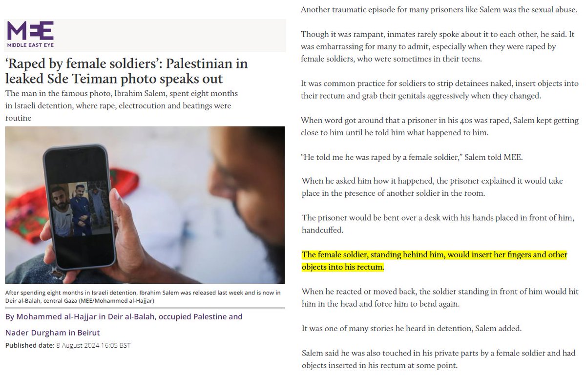 systematic Israeli mass rape of Palestinian children, girls, boys, men and women has now been extensively documented by the UN and countless testimonies. Yet the entire Western media and political class who still regurgitate the rape hoax are silent on it: https://t.co/ZXZLGLV3JL