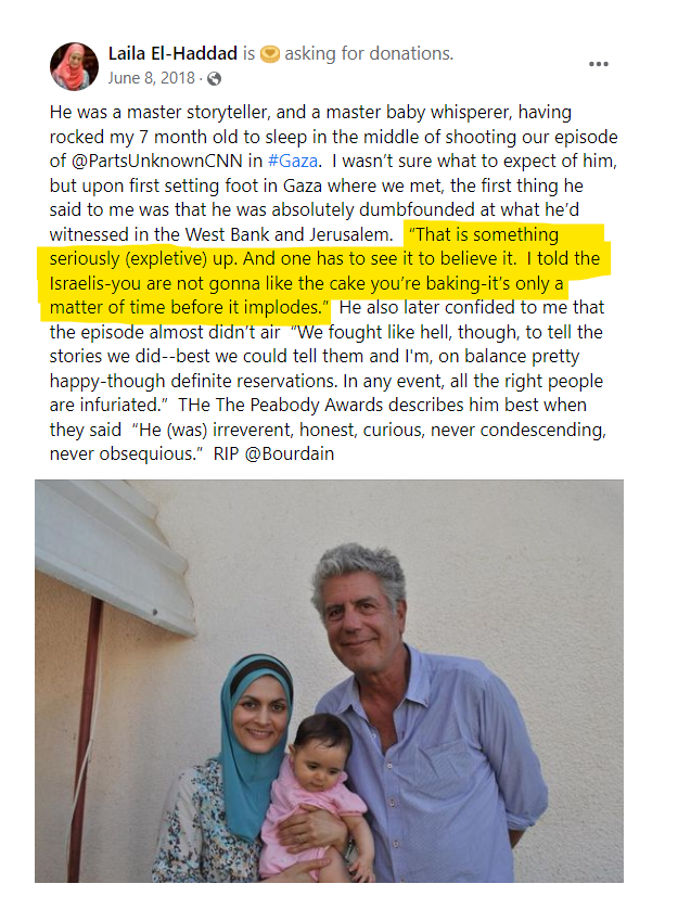 when Anthony Bourdain said free Palestine and called out the racist vilification of Palestinians by the media and political class: "The world has visited many terrible things on the Palestinian people, none more shameful than robbing them of their basic humanity." https://t.co/sBtOPFnzEt