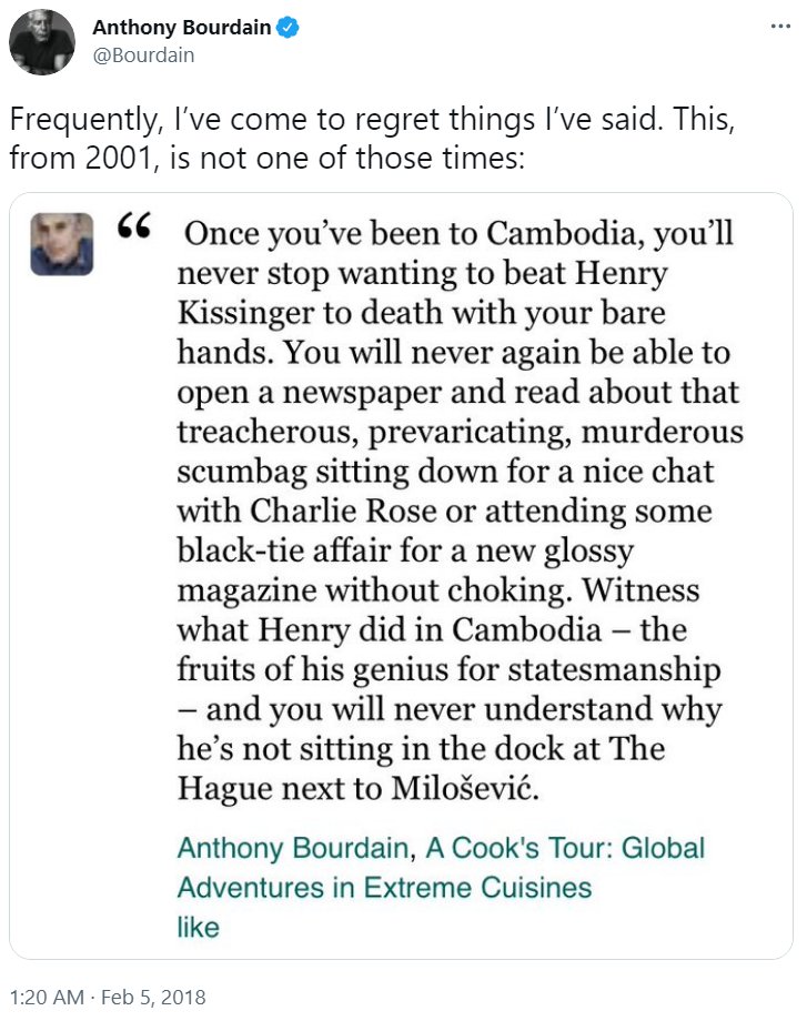Anthony Bourdain on his desire to beat Henry Kissinger to death after visiting Cambodia and seeing his genocidal depravity, and the same can be extended to Netanyahu, Genocide Joe, the entire Western media and political class for the ongoing Gaza genocide: https://t.co/dncT98lzD6 https://t.co/zKXMGjJ8X4