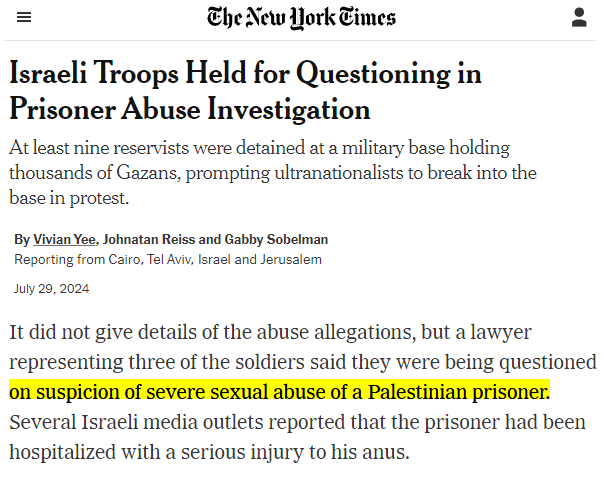 this is amazing. In their debunked "mass rape" hoax piece, the New York Times repeatedly, over and over again, uses the term rape. Rape, rape, rape. But for actual systematic mass rape of Palestinians, it only once says "suspicion of severe sexual abuse", and pretends like it's just about one case, ignoring the countless testimonies and reporting, including their own and from the UN, CNN, Haaretz and many others, about this being intentional, planned, systematic and widespread and directed at children, boys, girls, women and men. They're rape-laundering for Israel after fabricating and disseminating the most shameless brazen genocidal atrocity propaganda "mass rape" hoax for them to launder and further the Gaza genocide. These are the most depraved scum alive. Nothing comes close to their sick pathological depravity. Nothing.