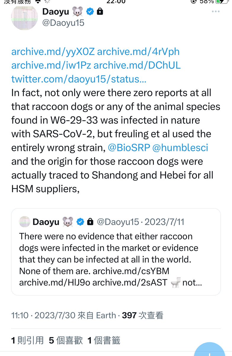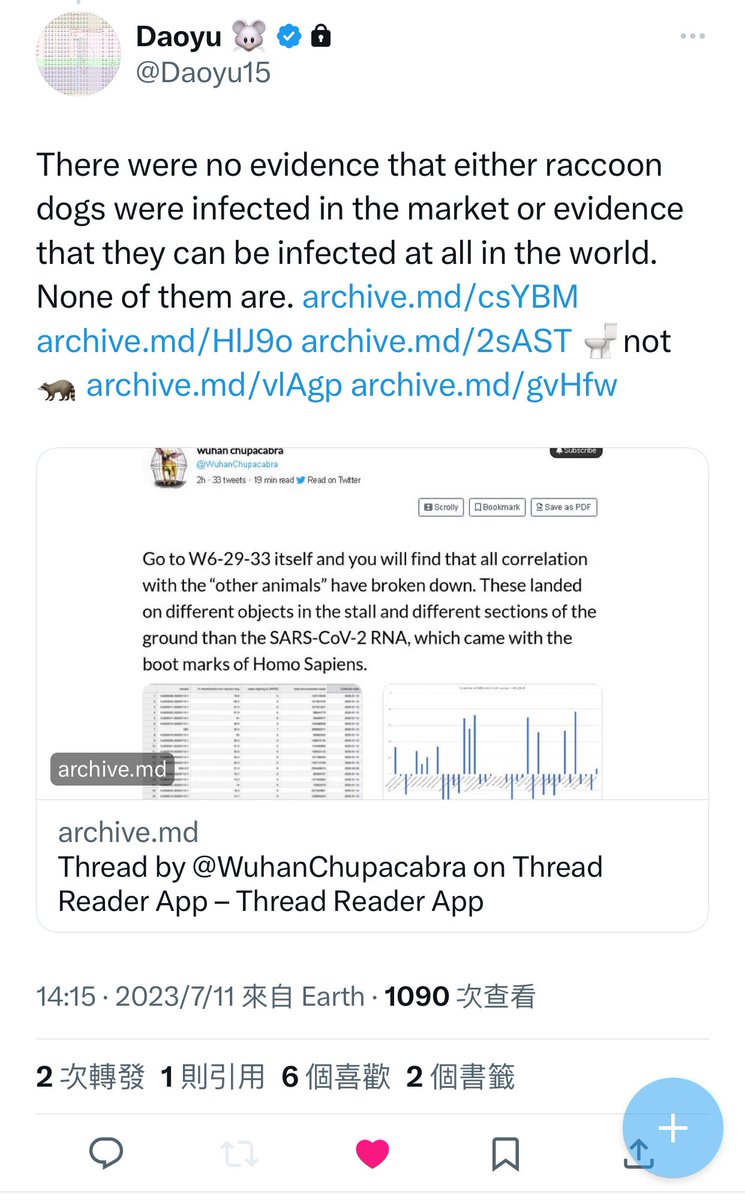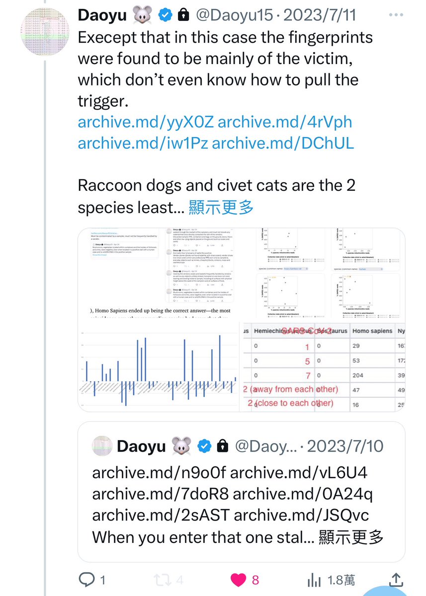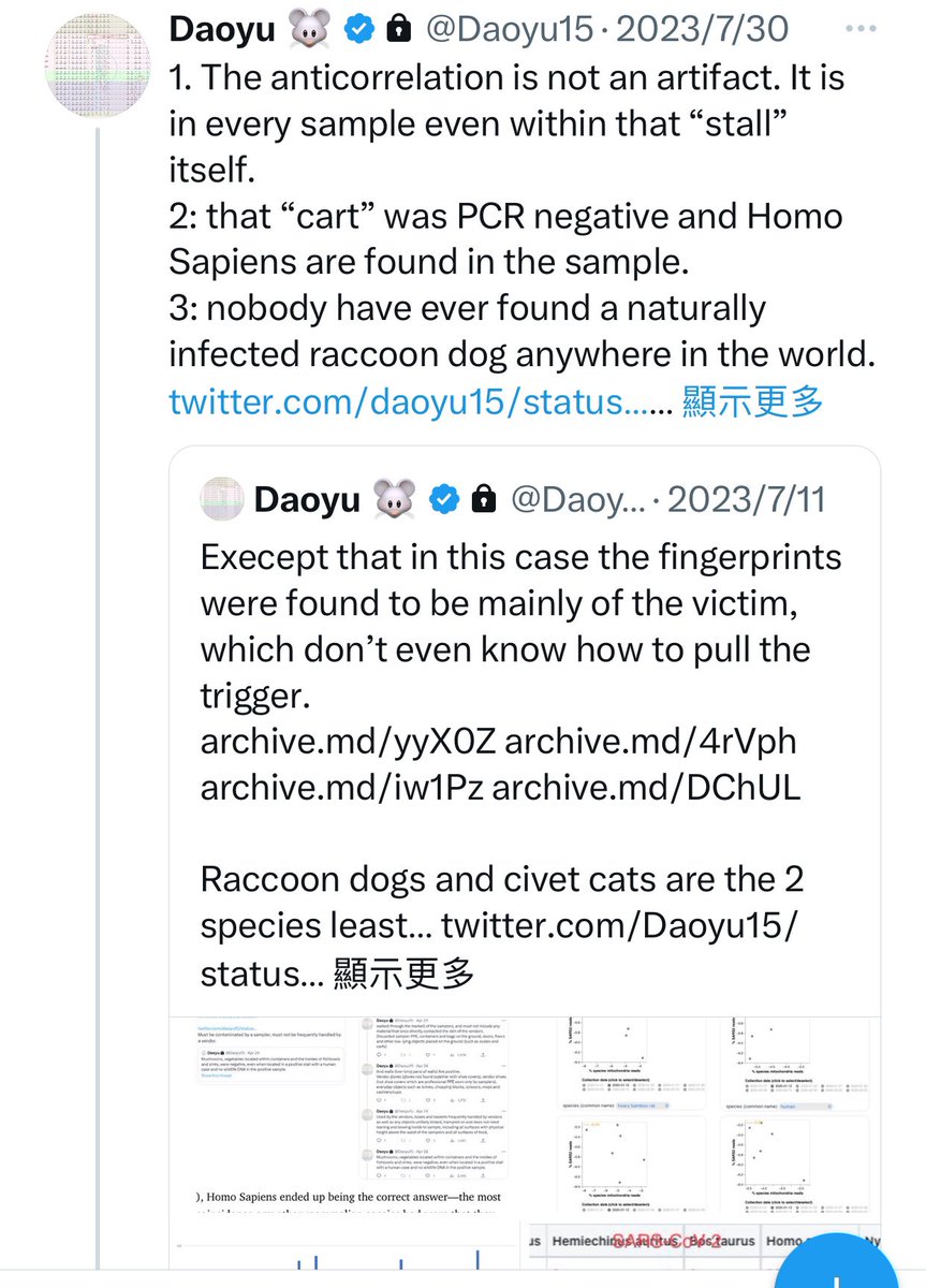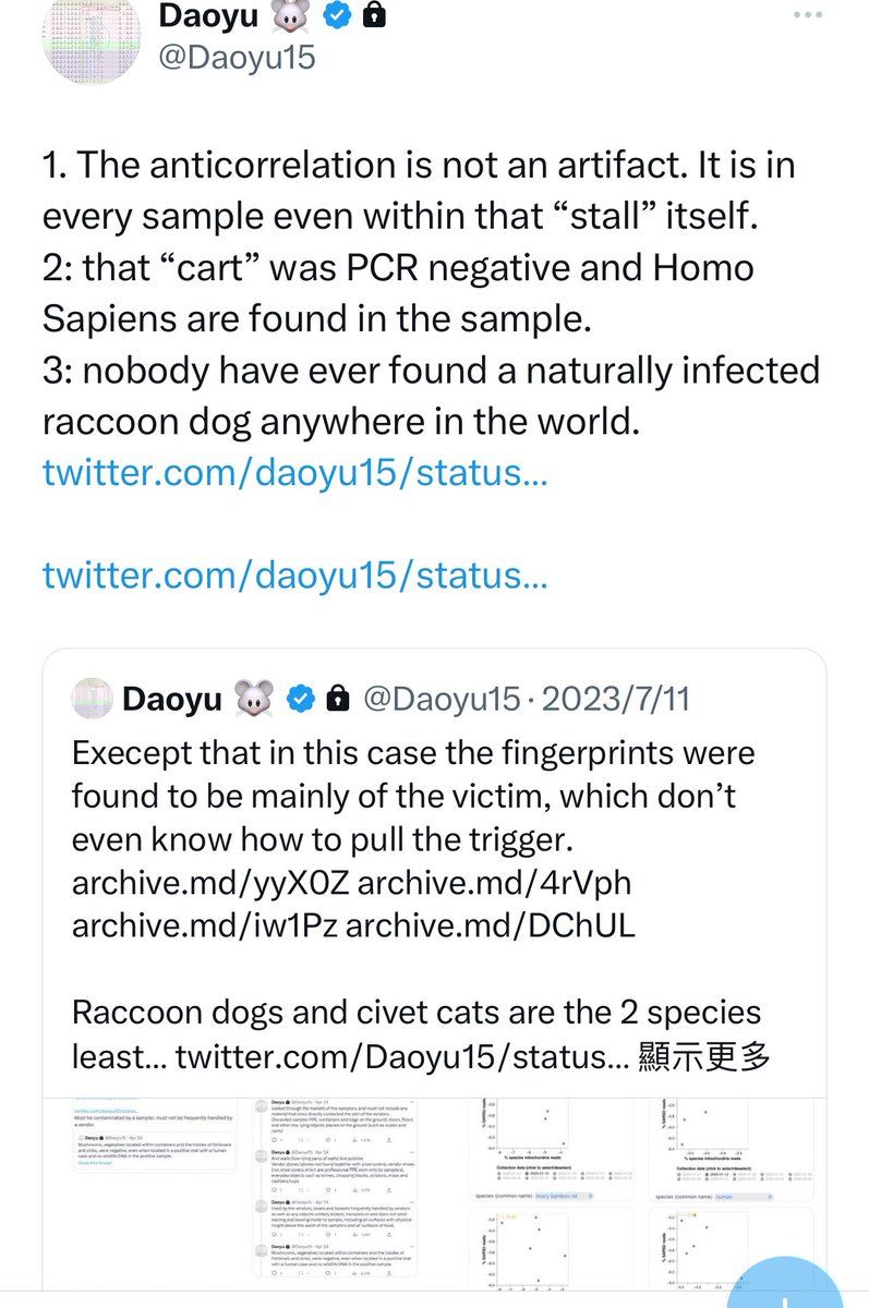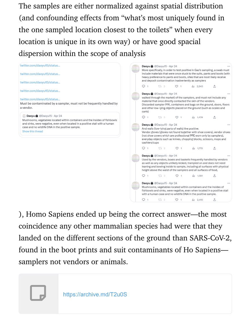 7/â¶ archive.md/yyX0Z archive.md/4rVph archive.md/iw1Pz archive.md/DChUL In fact, not only were there zero reports at all that raccoon dogs or any of the animal species found in W6-29-33 was infected in nature with SARS-CoV-2, @Daoyu15 https://t.co/f4CjBi0IW3