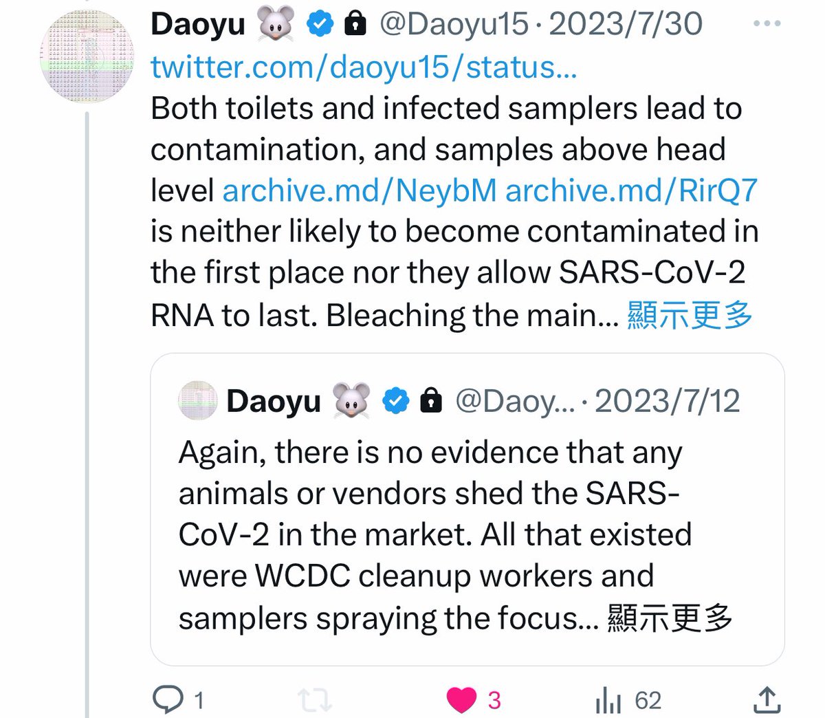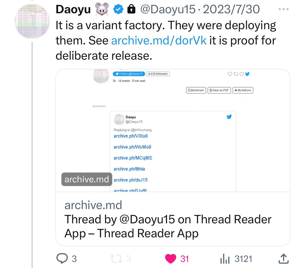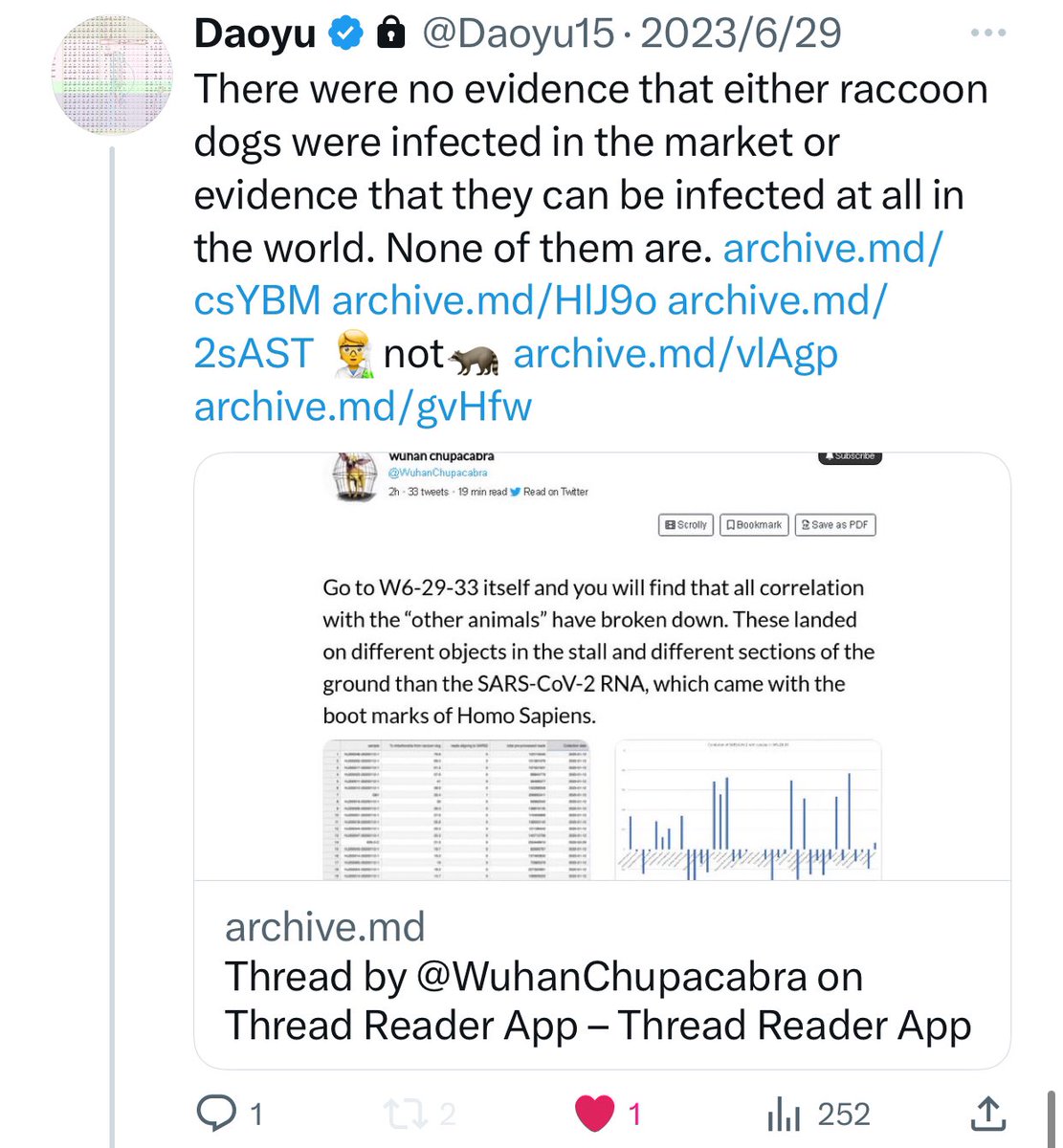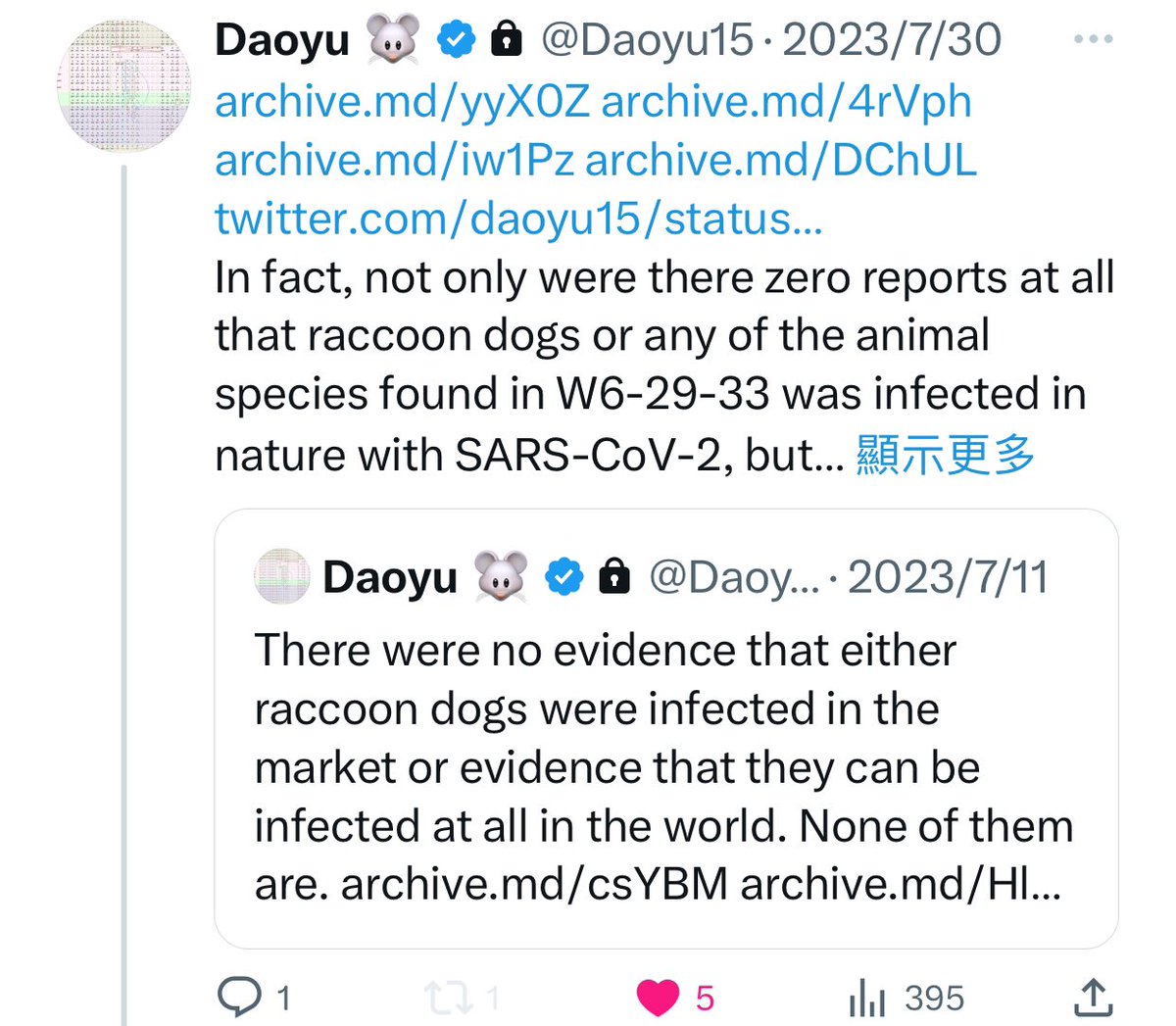 7/â¶ archive.md/yyX0Z archive.md/4rVph archive.md/iw1Pz archive.md/DChUL In fact, not only were there zero reports at all that raccoon dogs or any of the animal species found in W6-29-33 was infected in nature with SARS-CoV-2, @Daoyu15 https://t.co/f4CjBi0IW3