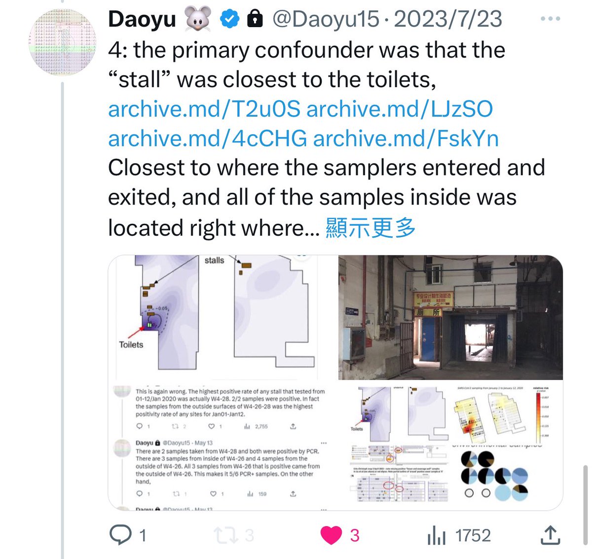 @Daoyu15 3/â¶ 4: the primary confounder was that the âstallâ was closest to the toilets, archive.md/T2u0S archive.md/LJzSO archive.md/4cCHG archive.md/FskYn Closest to where the samplers entered and exited, and all of the samples inside was located @Daoyu15 https://t.co/ED9LDueyGT