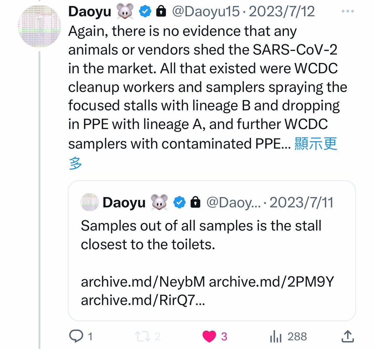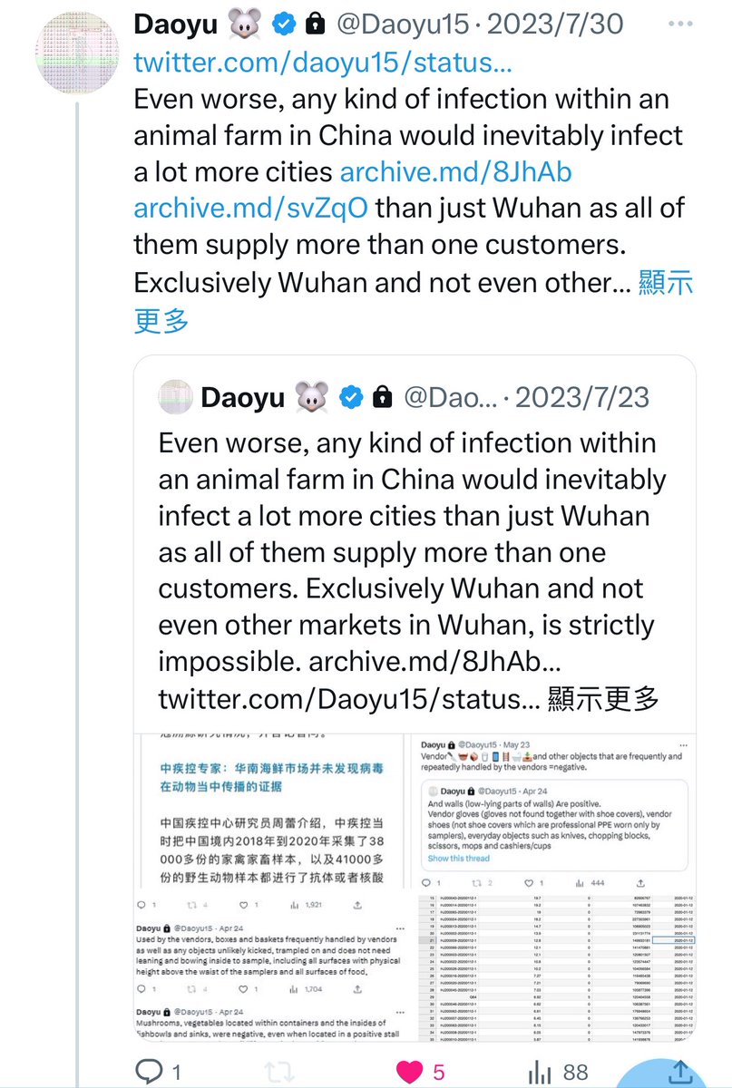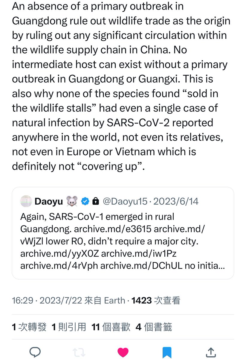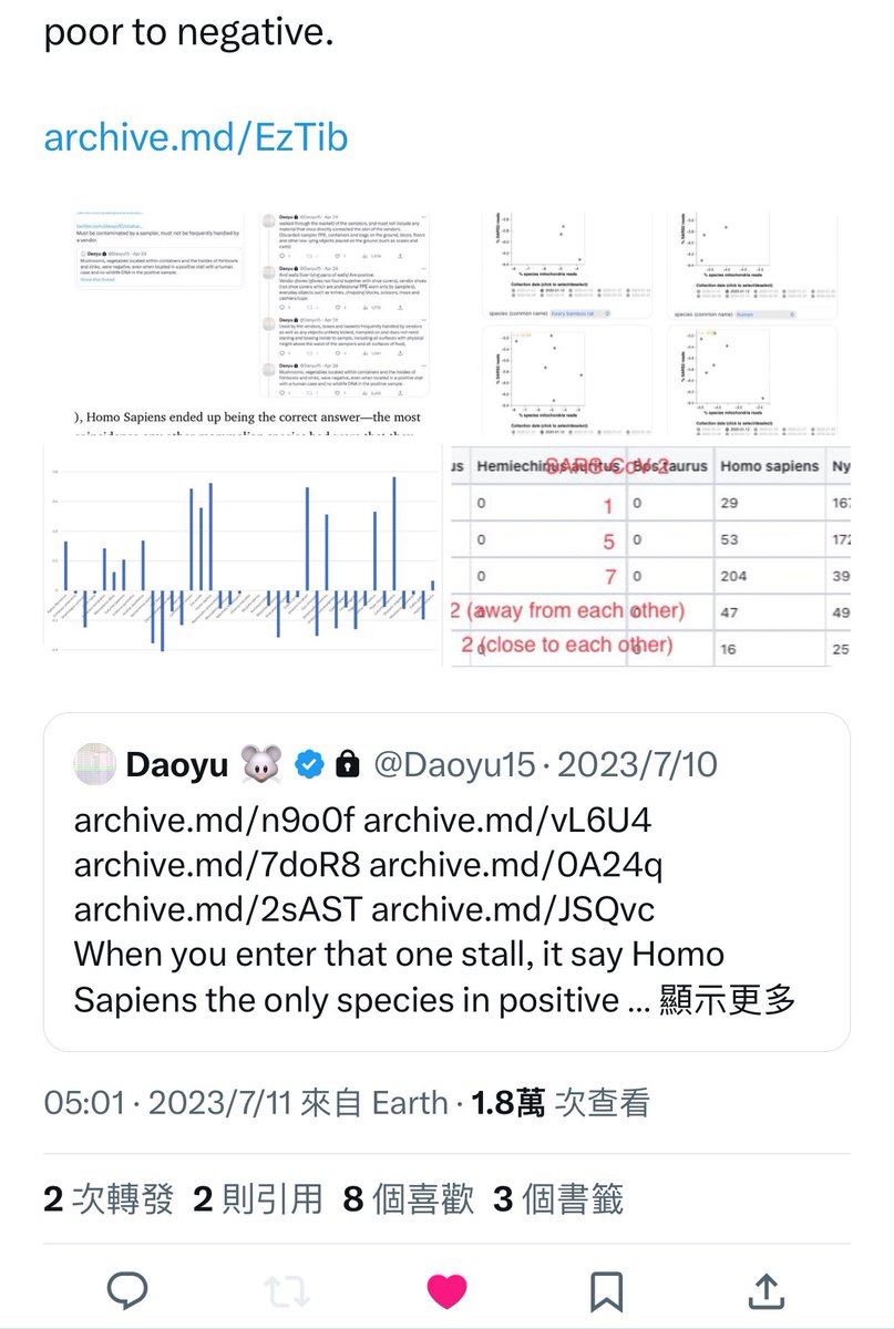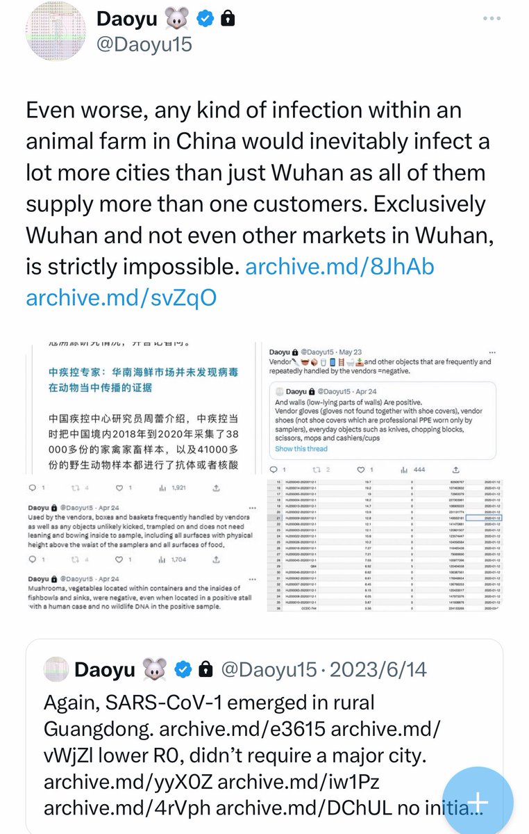 @Daoyu15 4-4/ @Daoyu15 archive.md/bK5mh There is systematic manipulation of early cases data by China. And there are accidentally released non-politically-significant data that exposed the exact opposite of zoonosis happening in Chinaâpre-Huanan SARS-CoV-2 not in animals or