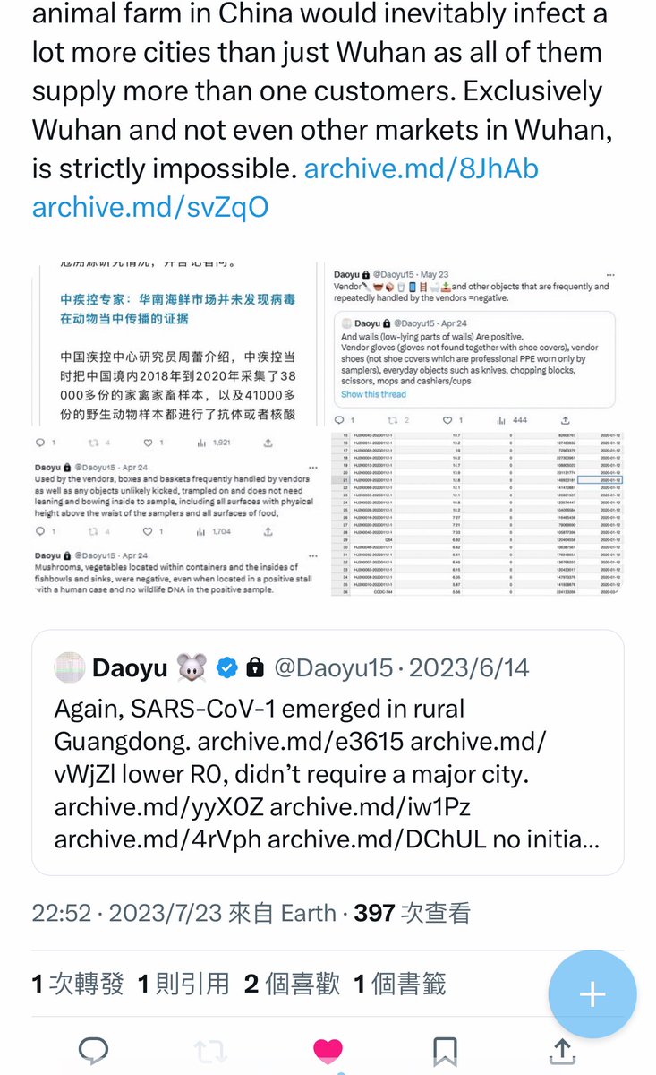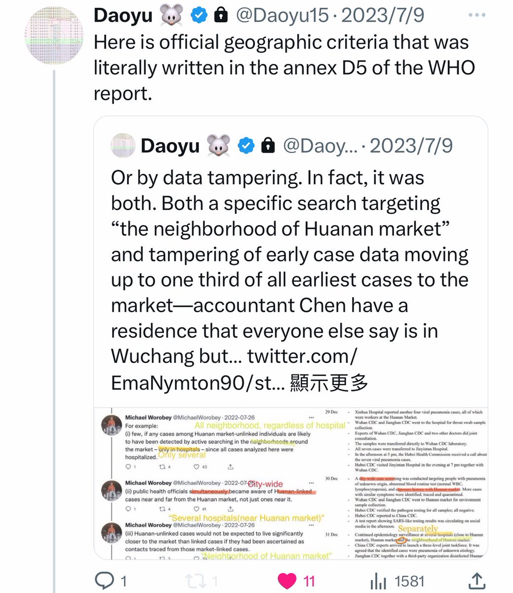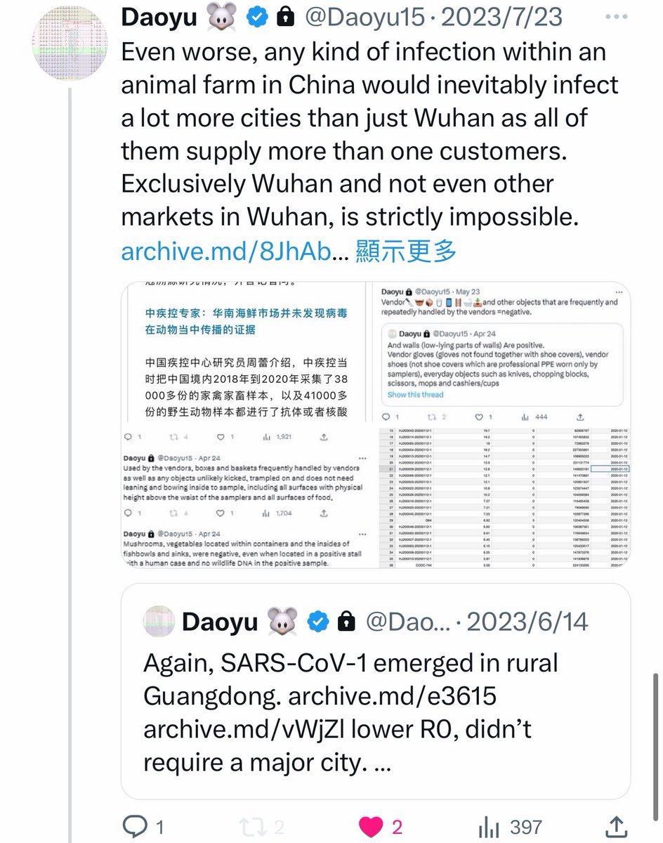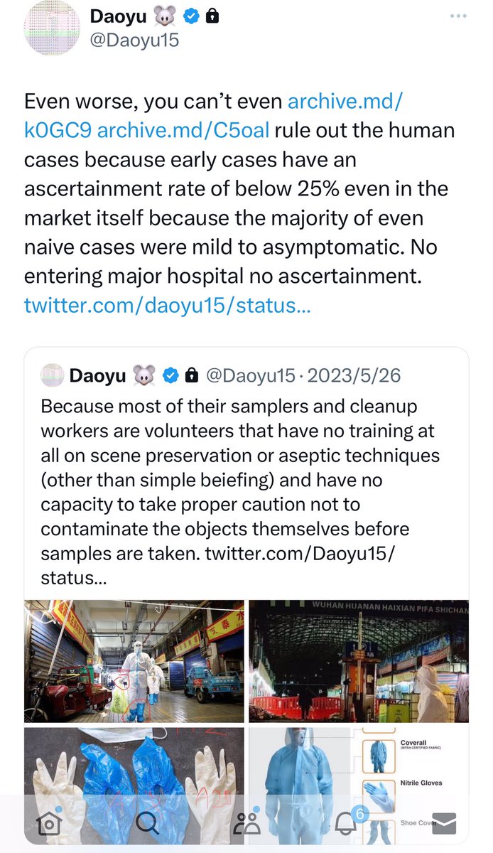 @Daoyu15 4åŒ @Daoyu15 X2-6 archive.md/ZgVzp Wuhan authorities after that archive.md/OIGPz 2014 incident now targeted only the Huanan market when looking for EID outbreaksâand nowhere else. archive.md/1x658 They tampered with the early cases data
