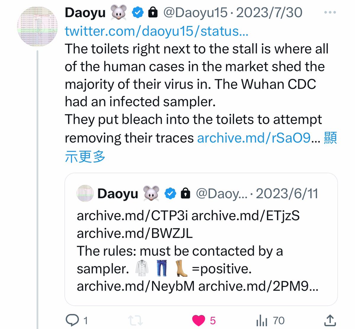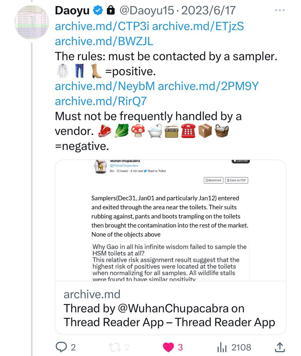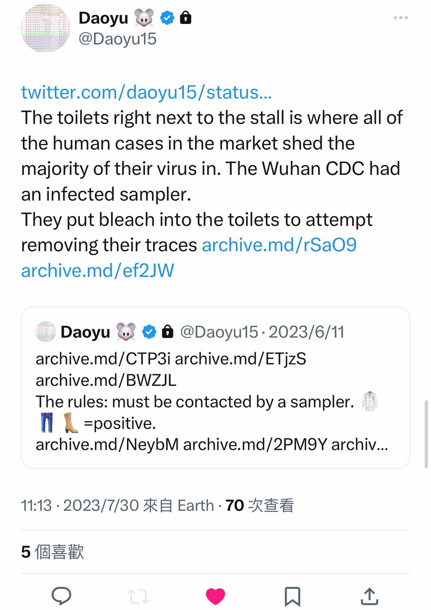 @Daoyu15 4åŒ @Daoyu15 X2-6 archive.md/ZgVzp Wuhan authorities after that archive.md/OIGPz 2014 incident now targeted only the Huanan market when looking for EID outbreaksâand nowhere else. archive.md/1x658 They tampered with the early cases data