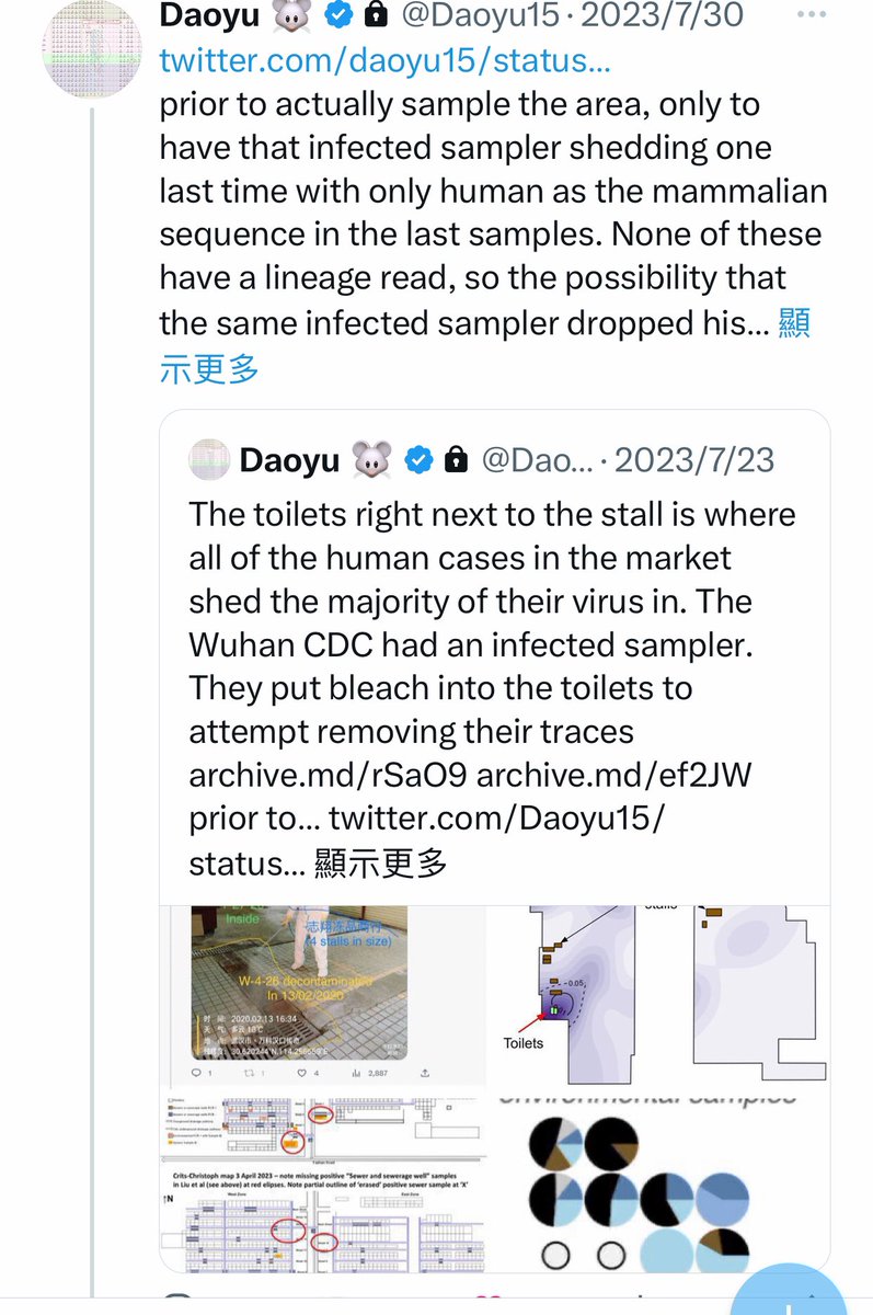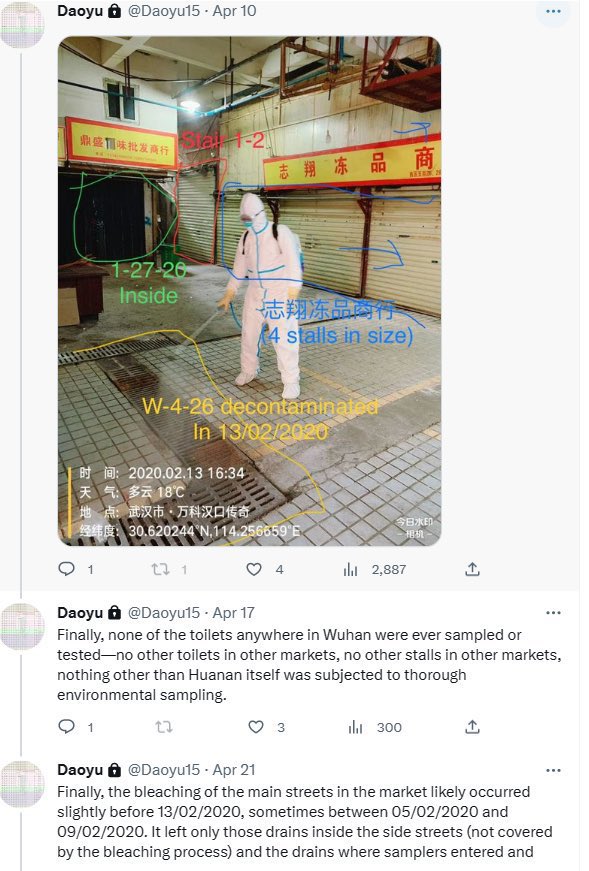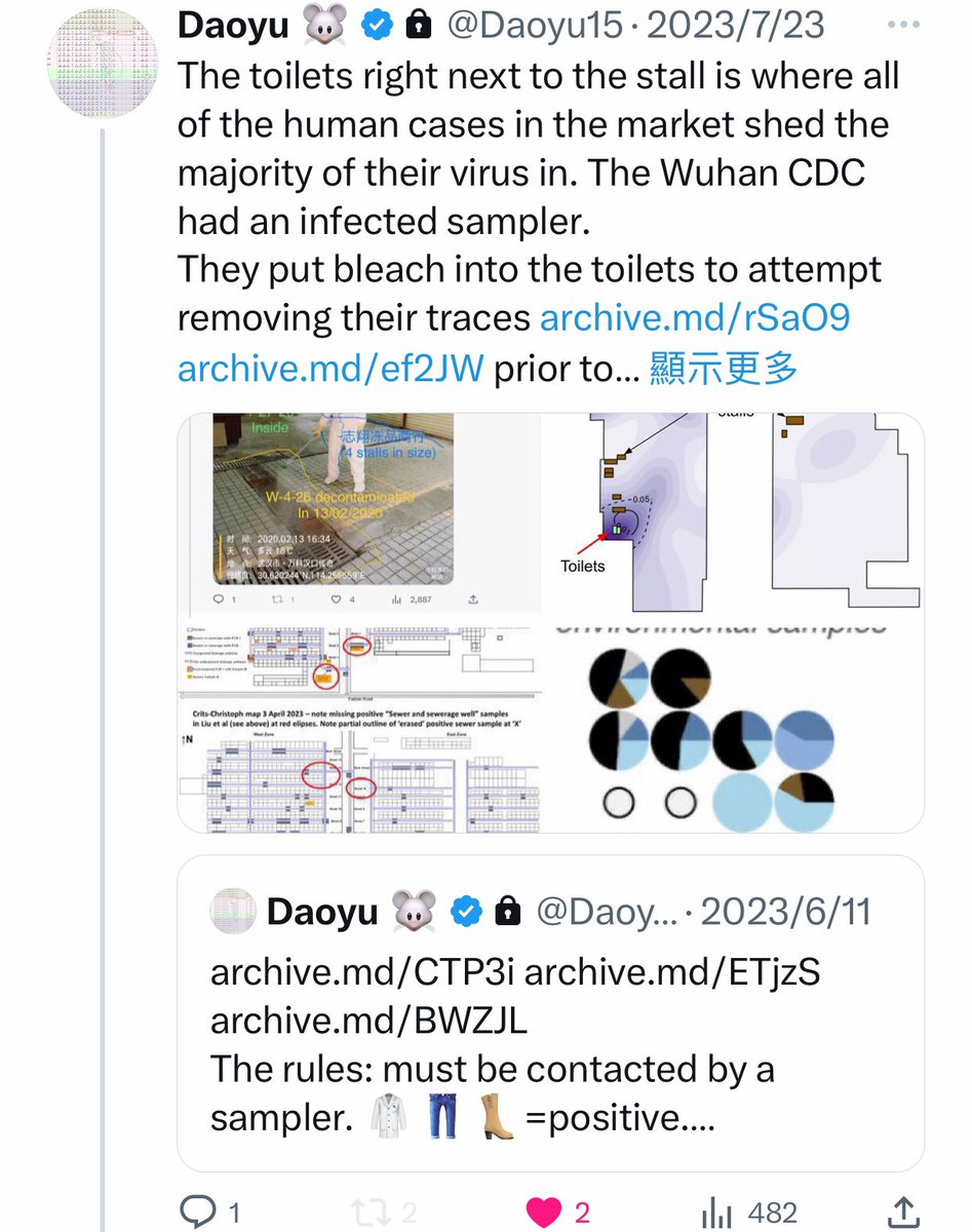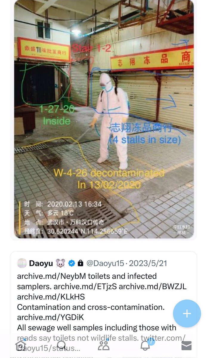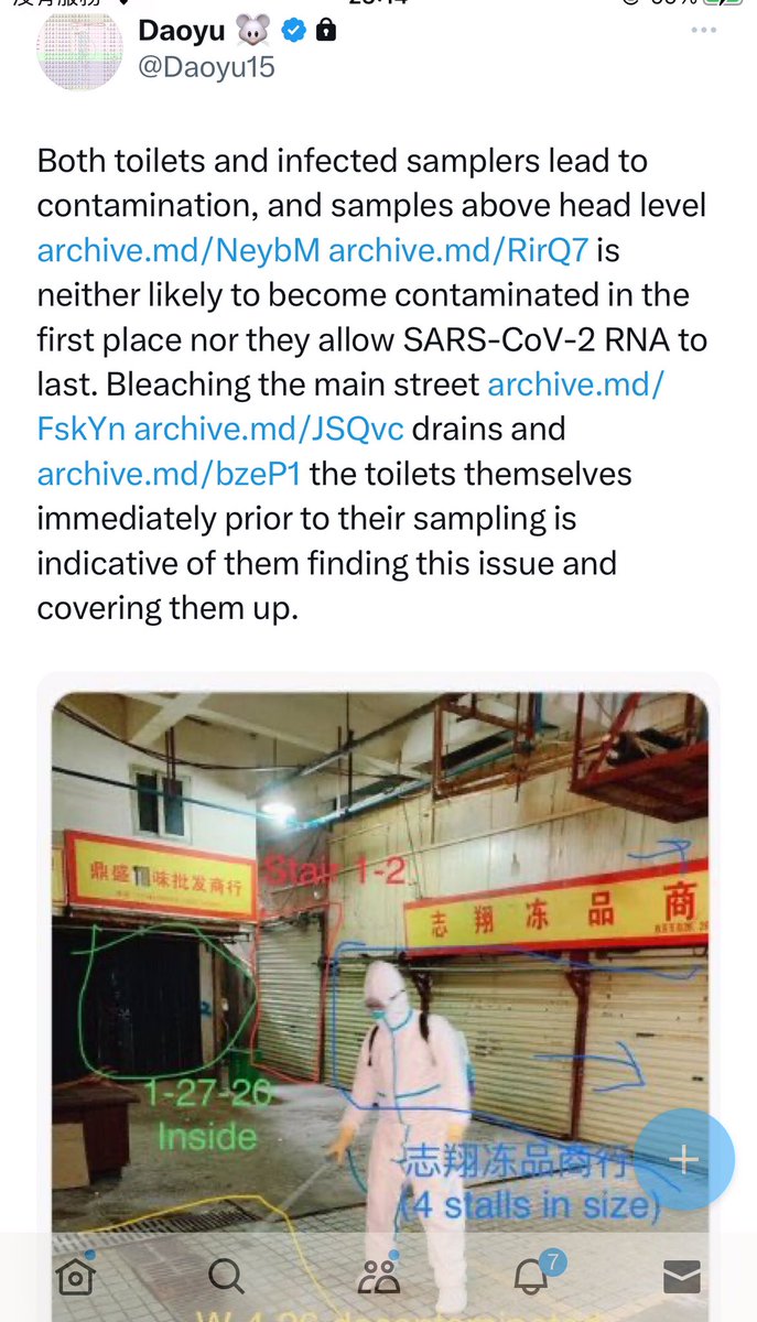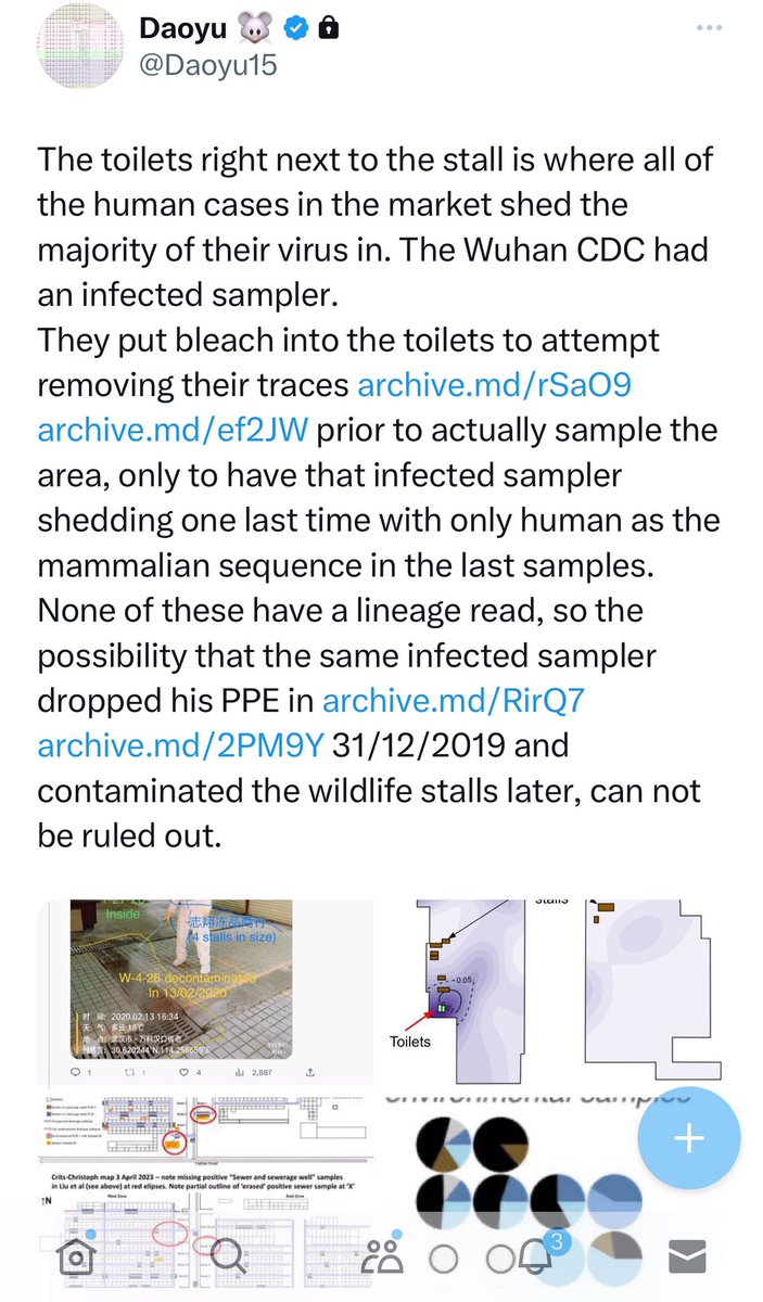 @Daoyu15 10/åŒâ¶ The toilets right next to the stall is where all of the human cases in the market shed the majority of their virus in. The Wuhan CDC had an infected sampler. They put bleach into the toilets to attempt removing their traces archive.md/rSaO9 archive.md/ef2JW https://t.co/qPgX0Y1yVo