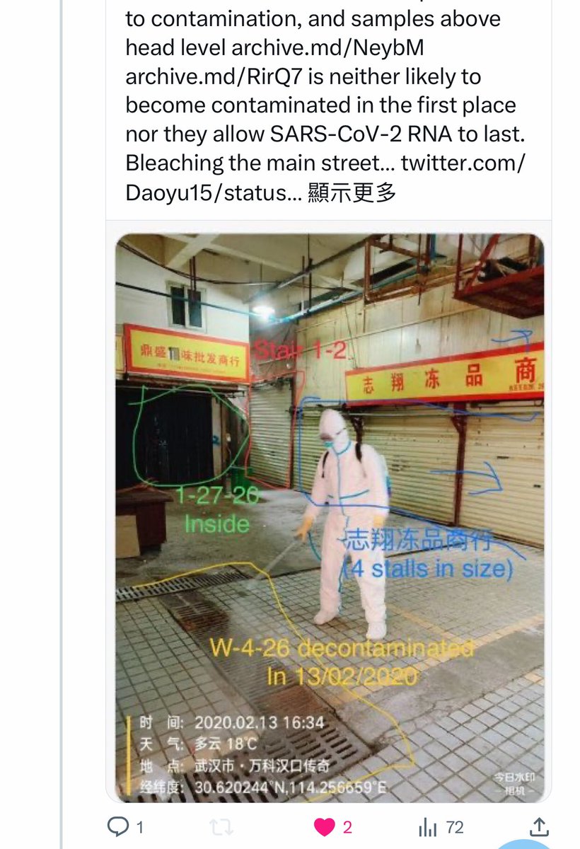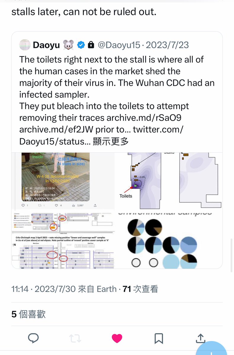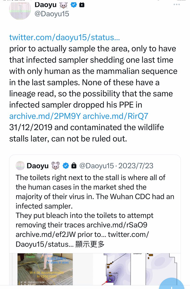 @Daoyu15 9/ The toilets right next to the stall is where all of the human cases in the market shed the majority of their virus in. The Wuhan CDC had an infected sampler. They put bleach into the toilets to attempt removing their traces archive.md/rSaO9 archive.md/ef2JW https://t.co/U7ML3taJsK