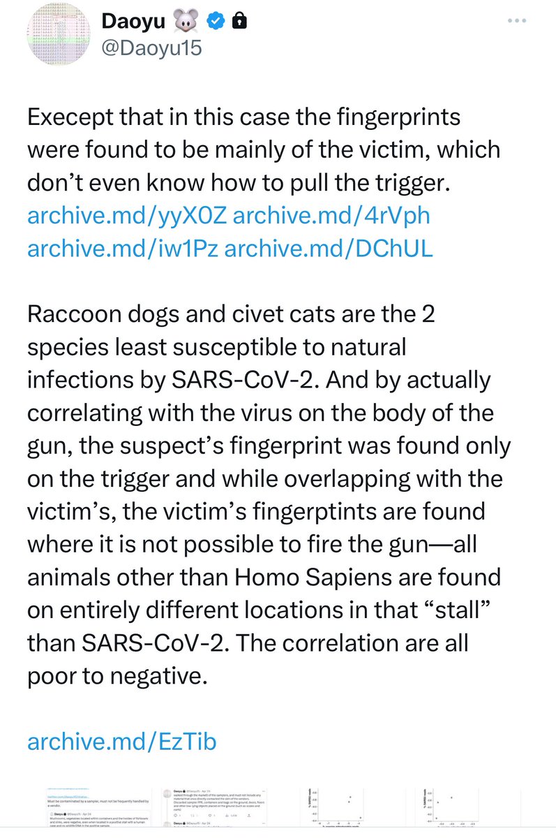 @Daoyu15 2/åŒçšâž the victimâs, the victimâs fingerptints are found where it is not possible to fire the gunâall animals other than Homo Sapiens are found on entirely different locations in that âstallâ than SARS-CoV-2. The correlation are all poor to negative. archive.md/EzTib