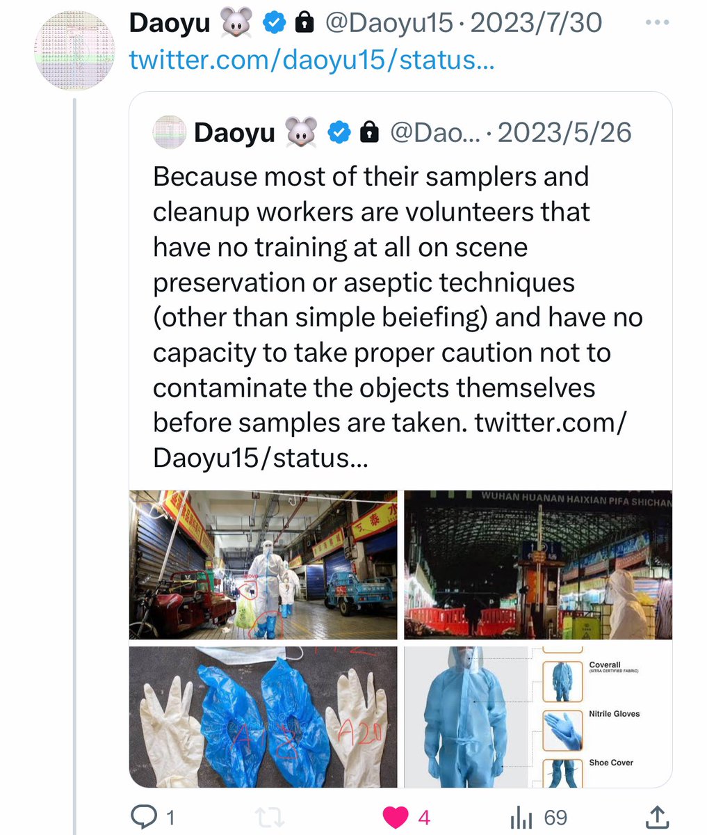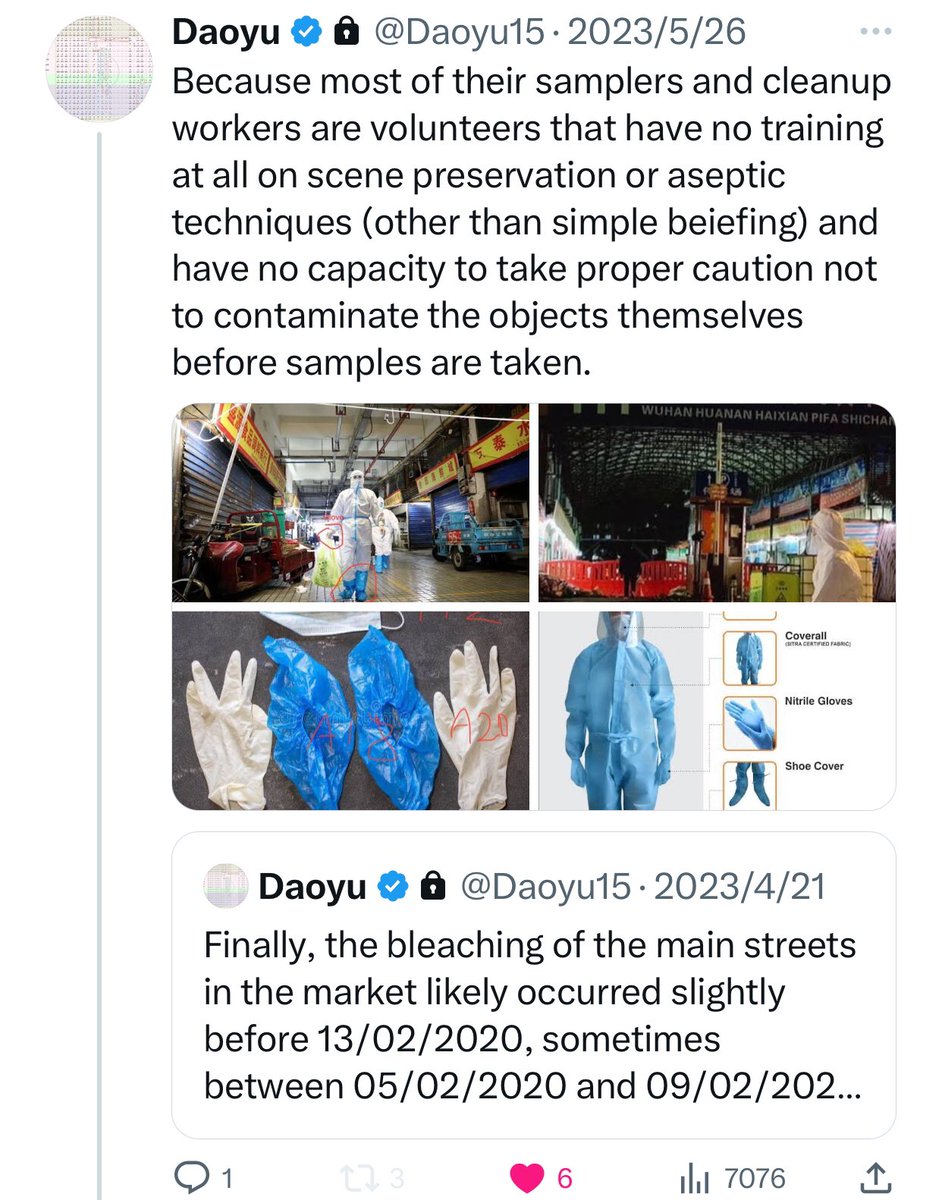 @Daoyu15 All of the positive salples in the market itself can be ultimately traced back a contaminated suit, boot and pant surfaces of the samplersâthese are mostly volunteers that have experience in neither scene preservation or aseptic techniques, contaminating surfaces and sample tubes https://t.co/v2JXkMe4uv