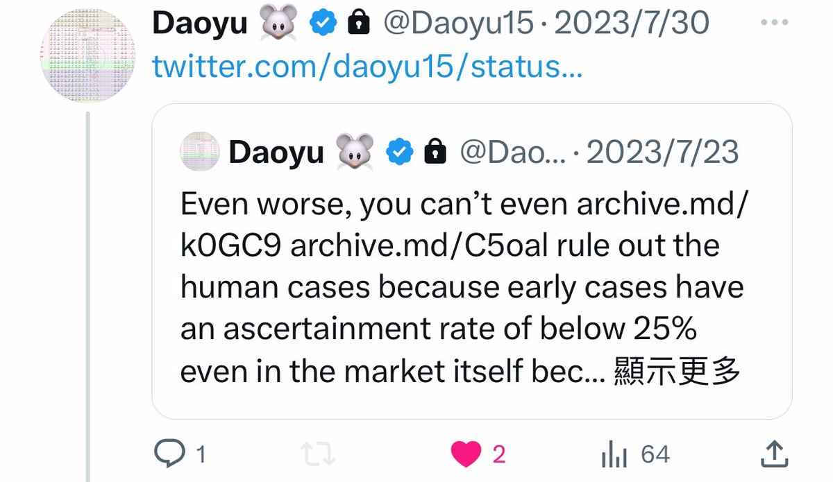@Daoyu15 13/â¶Even worse, you canât even archive.md/k0GC9 archive.md/C5oal rule out the human cases because early cases have an ascertainment rate of below 25% even in the market itself because the majority of even naive cases were mild to asymptomatic. @Daoyu15 https://t.co/xOjWh46khk