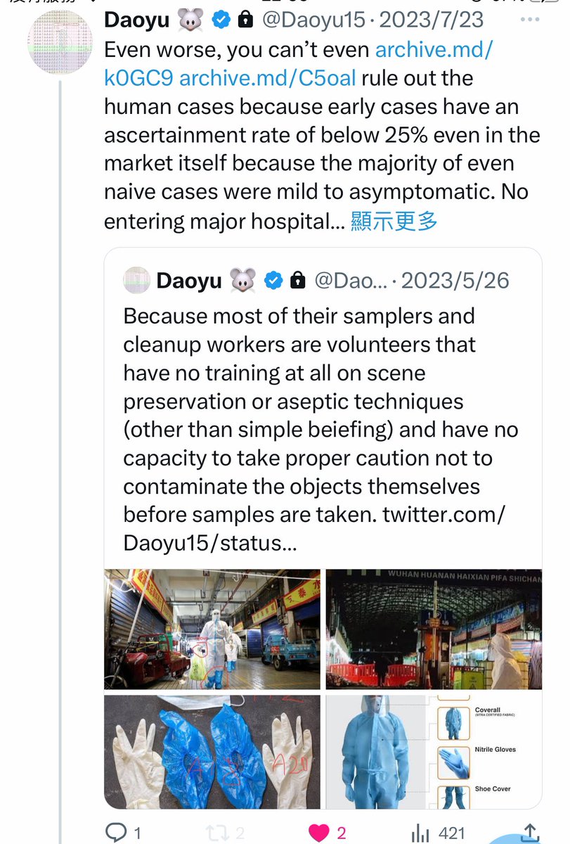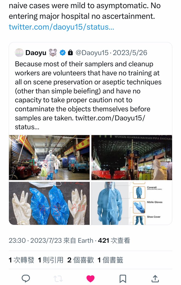 @Daoyu15 10/â· infected sampler dropped his PPE in archive.md/2PM9Y archive.md/RirQ7 31/12/2019 and contaminated the wildlife stalls later, can not be ruled out. @Daoyu15