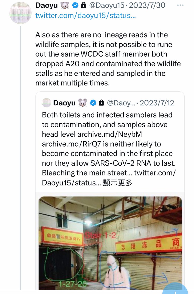 @Daoyu15 16/Also as there are no lineage reads in the wildlife samples, it is not possible to rune out the same WCDC staff member both dropped A20 and contaminated the wildlife stalls as he entered and sampled in the market multiple times. @Daoyu15 https://t.co/7hMYCuKkST