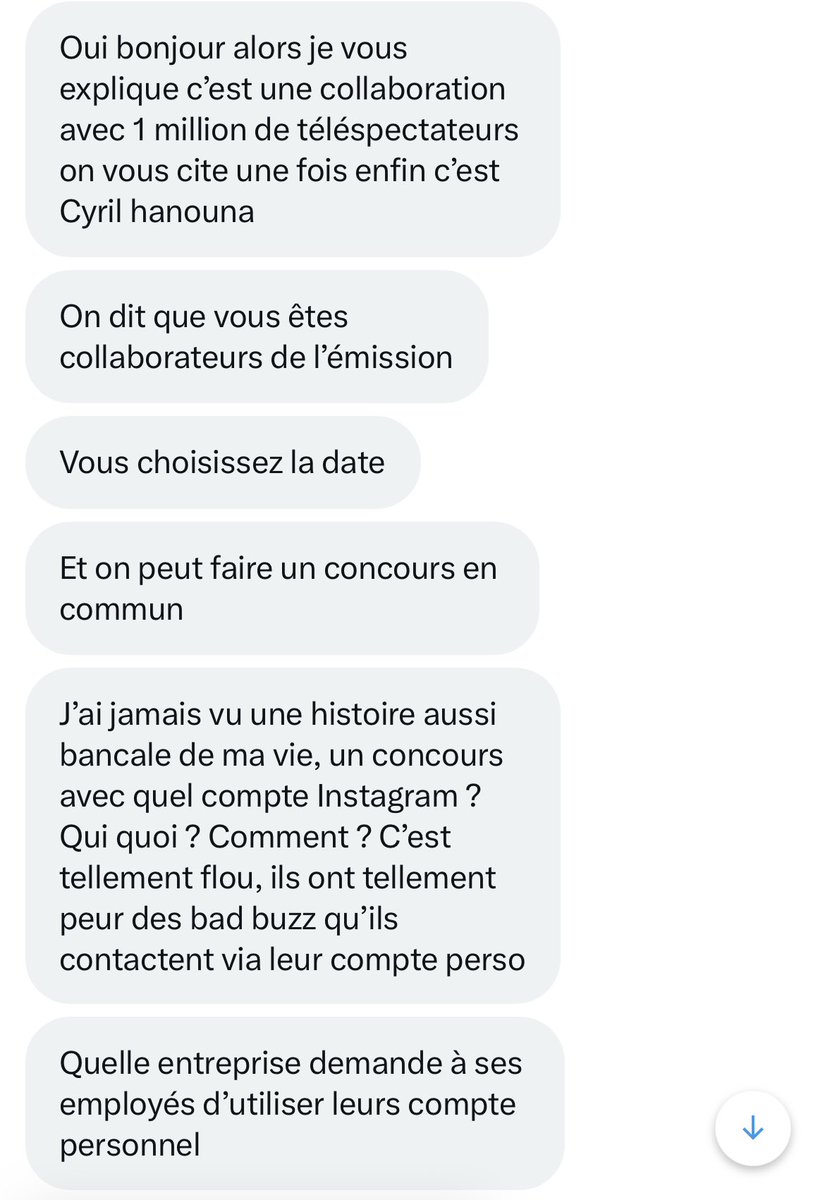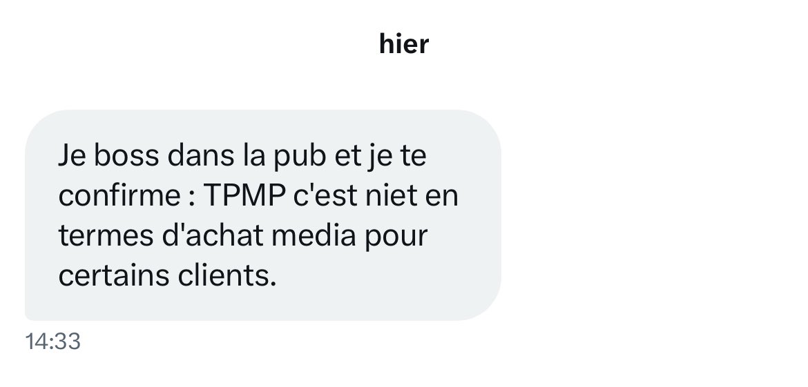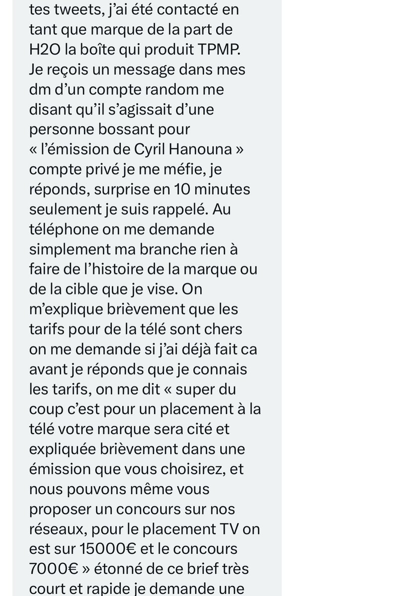 Plusieurs propriétaires de marque m’écrivent pour me dire que chez @TPMP c’est tellement la galère publicitaire en ce moment qu’ils doivent démarcher pour attraper le chaland avec leur téléphone perso ou leur compte Instagram en improvisant des placements produits n’importe quand n’importe comment. Il n’y a plus de grilles tarifaires, tout est fait à l’impro. Au feeling. Comme sur les fins de marché. Il n’y a même plus de démonstration comme avec les bonimenteurs. Ils chassent à quatre ou cinq les pigeons sur les réseaux sociaux et dès qu’ils en attrapent un ou une ils se le font en groupe. Dès qu’ils ont votre téléphone ils ne vous lâchent plus jusqu’à ce que vous payez les 15.000€ pour le placement produit ou le jeu concours. Contrairement à M6 ou @TF1 il n’y a plus de réglementation ou de tarification standard. C’est à la tête du client. Faut remplir les caisses. Faut payer les 4x4 de luxe du boss et les appartements dans le 16eme où le mètre carré est à 18.000€. Donc le placement d’un produit à 15.000€ ça ne paye même pas un des WC de l’appartement de @Cyrilhanouna. Donc il a décidé de former ses équipes le week-end directement sur un marché tunisien pour qu’ils apprennent à vendre mieux. Et voici le résultat ci-dessous.