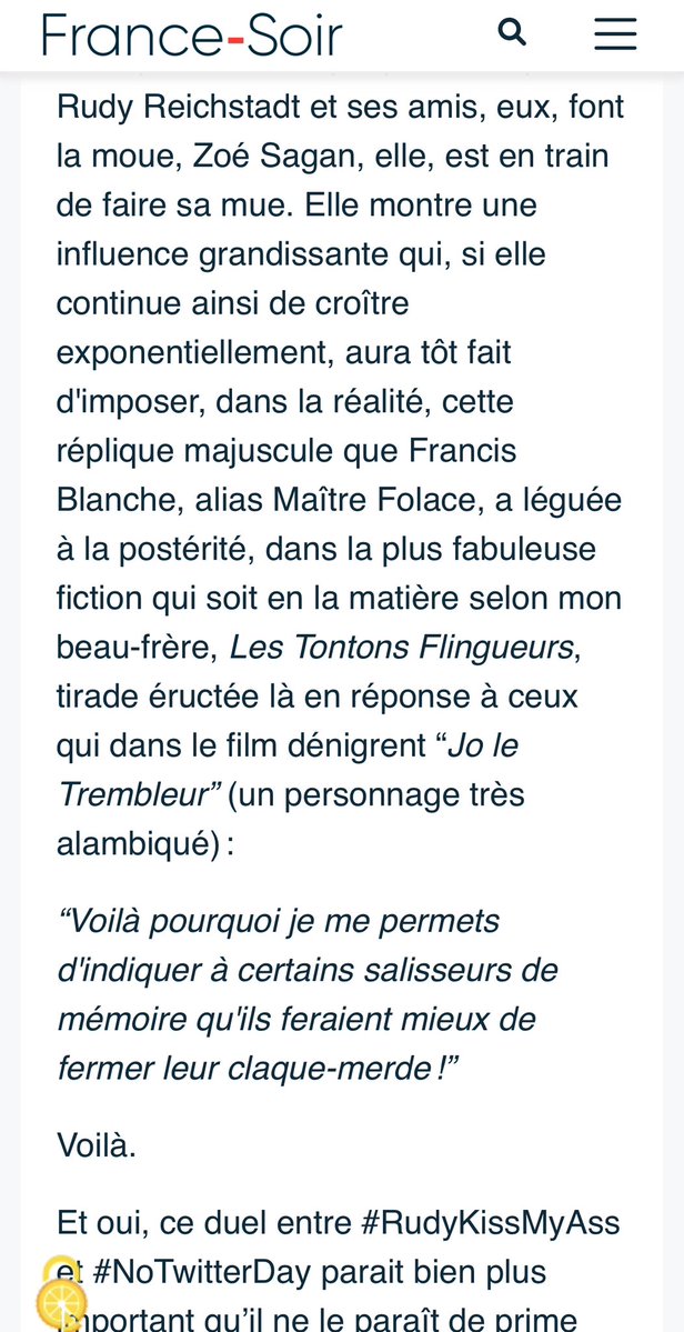 « Rudy Reichstadt et ses amis, eux, font la moue, Zoé Sagan, elle, est en train de faire sa mue. Elle montre une influence grandissante qui, si elle continue ainsi de croître exponentiellement, aura tôt fait d'imposer, dans la réalité, cette réplique majuscule que Francis Blanche, alias Maître Folace, a léguée à la postérité, dans la plus fabuleuse fiction qui soit en la matière selon mon beau-frère, Les Tontons Flingueurs, tirade éructée là en réponse à ceux qui dans le film dénigrent “Jo le Trembleur” (un personnage très alambiqué) : “Voilà pourquoi je me permets d'indiquer à certains salisseurs de mémoire qu'ils feraient mieux de fermer leur claque-merde !” Voilà. Et oui, ce duel entre #RudyKissMyAss et #NoTwitterDay parait bien plus important qu’il ne le paraît de prime abord. Il traduit le bras de fer qui s’exerce entre un Elon Musk qui s’évertue à libérer la parole sur X, en améliorant le débat contradictoire et la vérification de l’information avec les Community Notes (service qui permet aux utilisateurs de décrire si une information est utile, sérieuse ou pas) et un Thierry Breton qui veut contraindre X à se conformer aux règles du Digital Service Act entré en action fin août 2023. Et puisque nous sommes en démocratie, toujours sans aucun parti pris, cela ne serait-il pas justice ? Après tout, Zoé Sagan s'emploie à montrer que le pouvoir est aux lecteurs. Alors qu'à l'inverse Rudy Reichstadt et ses comparses veulent le donner... à un Thierry Breton qui désire réduire la liberté d'expression. Pour Breton, c’est “Power to a few non elected” (“Le pouvoir à un petit groupe non élu”). John Lennon avait rêvé et chanté “Power to the people” Elon Musk l’a fait : Power to the readers. Eh oui, l’information libère ! » https://www.francesoir.fr/opinions-editos/rudykissmyass-contre-notwitterday-0