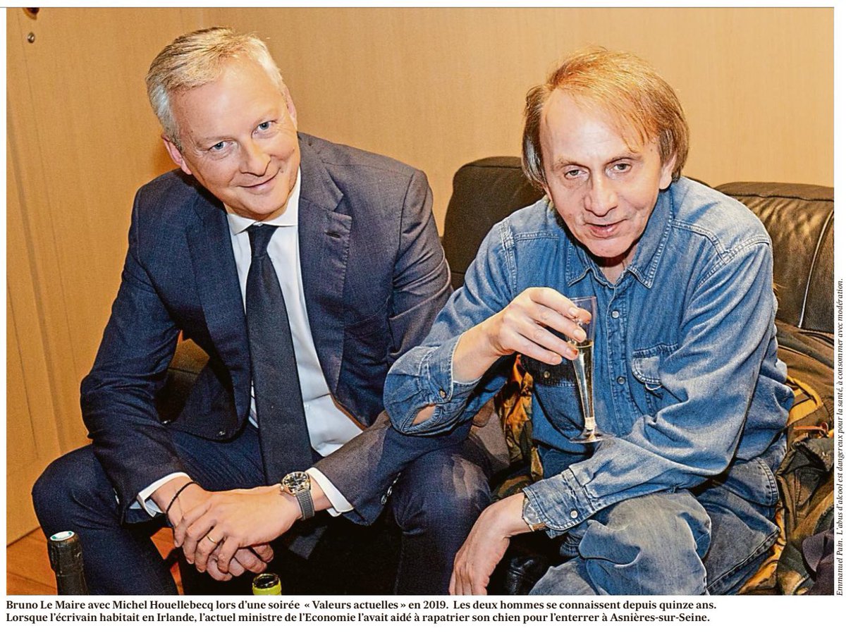 Il y a eu un drame dans le milieu de l’édition et de la politique récemment, dont vous n’avez jamais entendu parler. L’histoire vaut le coup d’être racontée aujourd’hui. Ça concerne les couples Houellebecq et Le Maire. Accrochez-vous bien, c’est mieux qu’extension du domaine de la pute. Michel et @BrunoLeMaire avaient un projet de livre semi-pornographique ensemble. À quatre mains. Les éditeurs étaient en furie. Les avaloirs étaient colossaux. Les tirages prévus stratosphériques. La promotion mondiale. Le texte devait être traduit simultanément en vingt langues. Mais il y a eu un problème qui a fait dérailler la machine. Pour comprendre, il faut revenir aux origines. Bruno, depuis enfant, a toujours voulu, comme @EmmanuelMacron, être romancier. C’était son rêve. Michel Houellebecq, en le rencontrant il y a 15 ans, a immédiatement saisi cette fêlure. Ce caprice inaccompli de l’enfant en lui, qui n’était pas un artiste. Il s’est alors infiltré en lui. Dans sa vie. Il est devenu son ami. Son meilleur ami. Son seul ami peut-être. Pour prouver au ministre que l’écrivain ne riait pas, il en a fait un personnage de son dernier roman. Sans s’en cacher. Bruno était alors aux anges. La confiance s’installait enfin. Les uns dormaient chez les autres. Laissant la nuit les portes ouvertes pour les uns ou les autres. Une amitié libre et bohème, très "années soixante-dix". À tel point que c’est Michel, dans un élan de subversion, qui a convaincu le ministre de parler de sexualité hardcore dans son dernier livre. Sauf, qu’un matin, après un week-end arrosé de vins, de vers et de vices, Bruno reçu un coup de téléphone des services de renseignements français, lui disant que la femme de Michel travaillait en réalité pour les services chinois et que dans une autre vie, elle avait eu potentiellement des activités de call-girl. Bruno, ne voulant pas perdre ce projet de livre, refusa dans un premier temps de briser sa relation avec le couple Houellebecq. Mais les services ont dû alors passer à la vitesse supérieure pour l’obliger à l’arrêter. Des images avaient sans doute déjà été captées. Ses téléphones et ordinateurs doublés. Ses maisons sur écoute. Lui, se pensait romancier à temps complet depuis son rôle dans le livre de Michel, mais il était aussi ministre de l’Économie française. Au bureau, pendant cette période, il n’a fait qu’écrire des lettres d’amour à Michel. Il n’allait plus en réunion. Il ne répondait plus à aucun mail. Il annulait même ses déjeuners pour rester seul dans son bureau à revoir les photos de Michel, lui et sa femme en vacances. Ça n’allait pas. Jusqu’à ce qu’il trouve une idée. Une idée qui allait tout sauver. Le projet de titre allait être : "le ministre, le grand écrivain et l'espionne de Pékin". Mais les services de renseignement ont dû vite le recadrer. Lui expliquant qu’il n’était plus un enfant. Qu’il avait des responsabilités et que les Français comptaient sur lui pour qu’un plein de courses ne coûte pas le prix d’une assurance-vie. Aujourd’hui, Bruno ne voit plus officiellement Michel, ni sa femme. Et le projet de livre est à l’arrêt. Il se raconte qu’il lui arrive cependant d’espérer la chute de la Ve République, pour retourner faire ce qu’il a toujours rêvé d’être, à savoir, un romancier coquin.