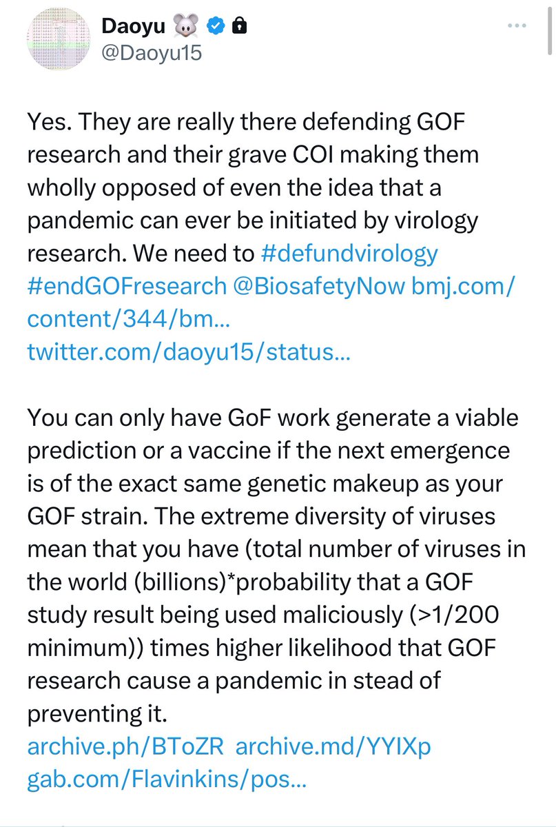 Yes. They are really there defending GOF research and their grave COI making them wholly opposed of even the idea that a pandemic can ever be initiated by virology research. We need to #defundvirology #endGOFresearch https://www.bmj.com/content/344/bmj.e2398
