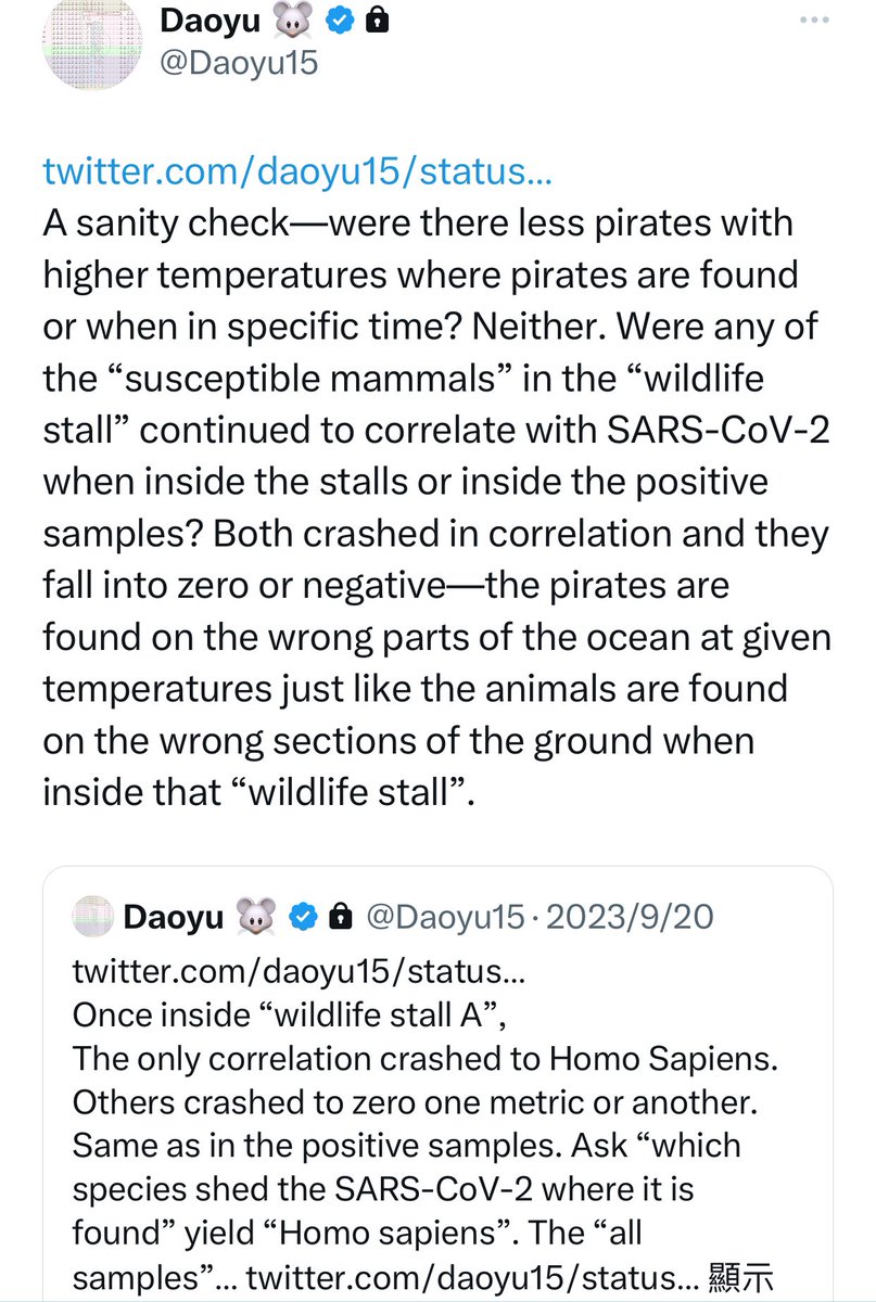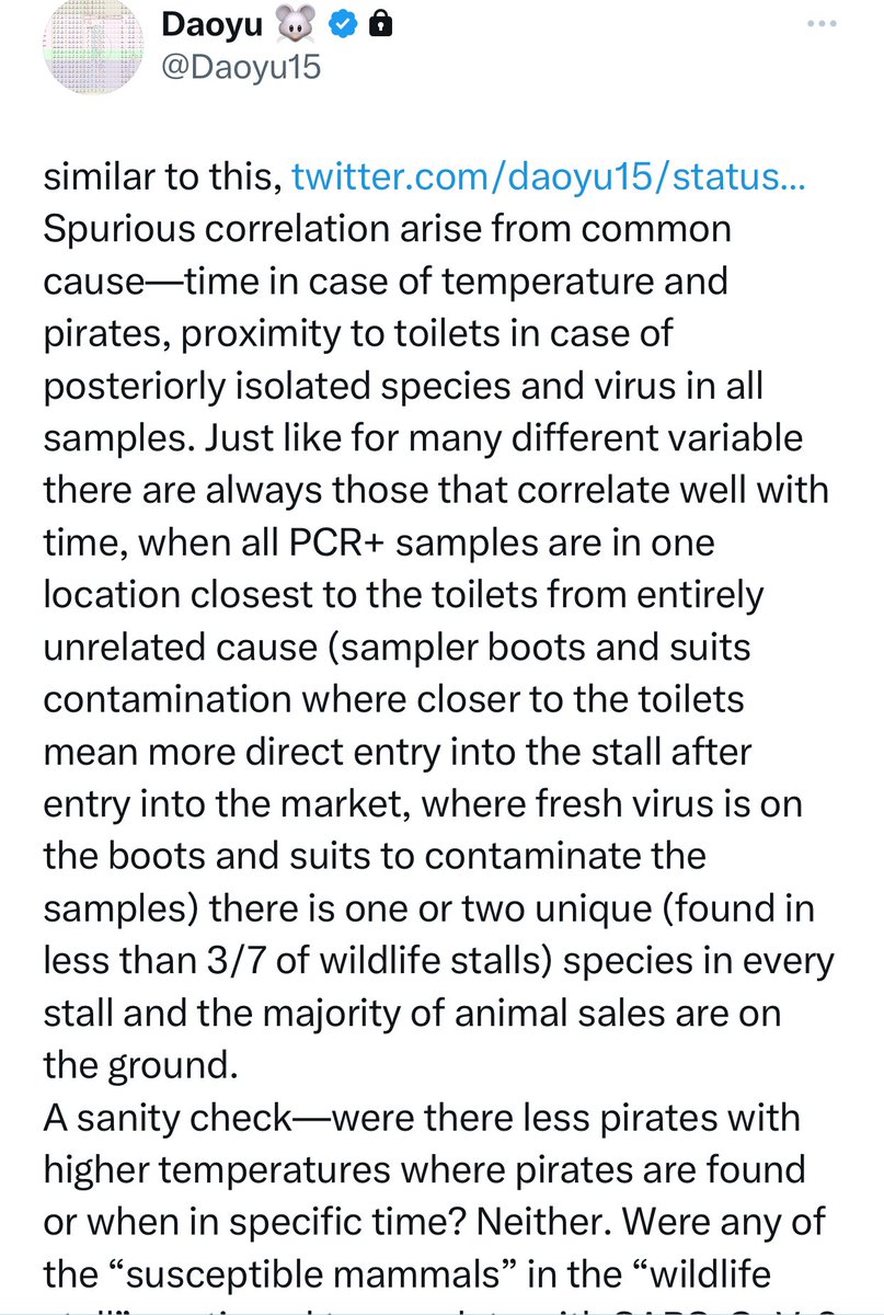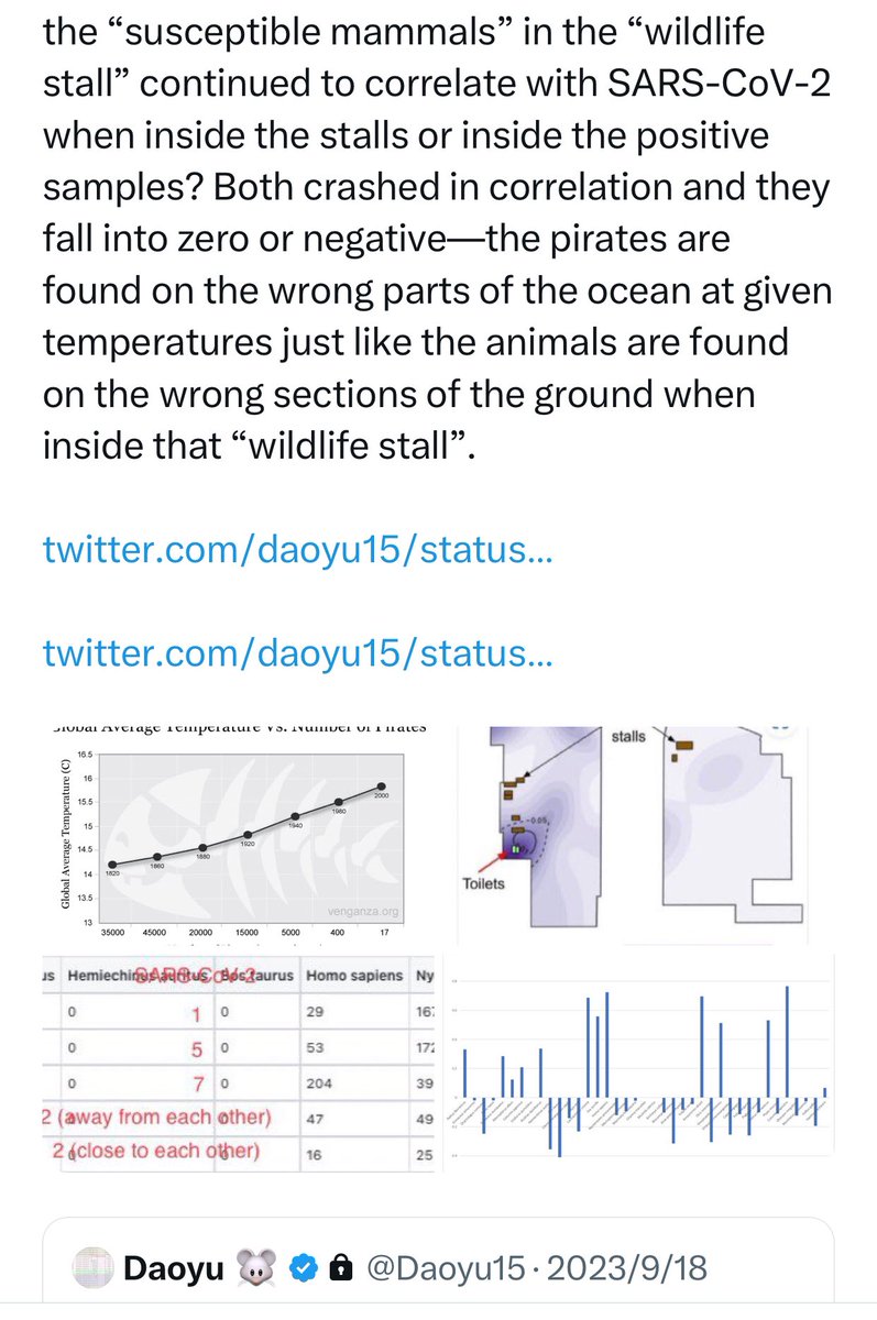 A sanity check—were there less pirates with higher temperatures where pirates are found or when in specific time? Neither. Were any of the “susceptible mammals” in the “wildlife stall” continued to correlate with SARS-CoV-2 when inside the stalls or inside the https://t.co/Ogfpf1jIoH
