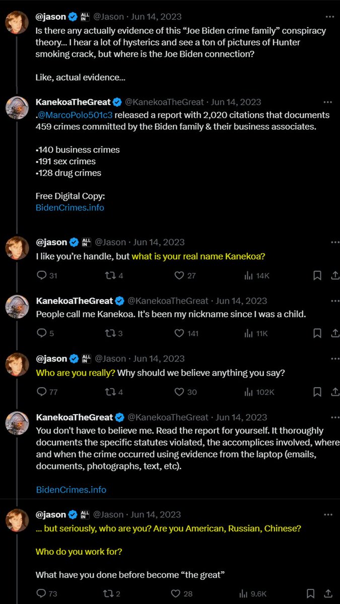 Instead of discussing the evidence, Jason asked about my real name, nationality, and employer, apparently assuming I was a foreign agent after I provided evidence of the Biden family's crimes: