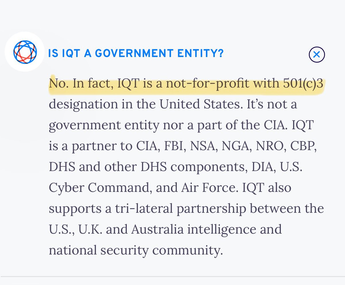 “IQT receives regular oversight from the CIA and other client agencies, who keep Congress informed of the company’s activities.”