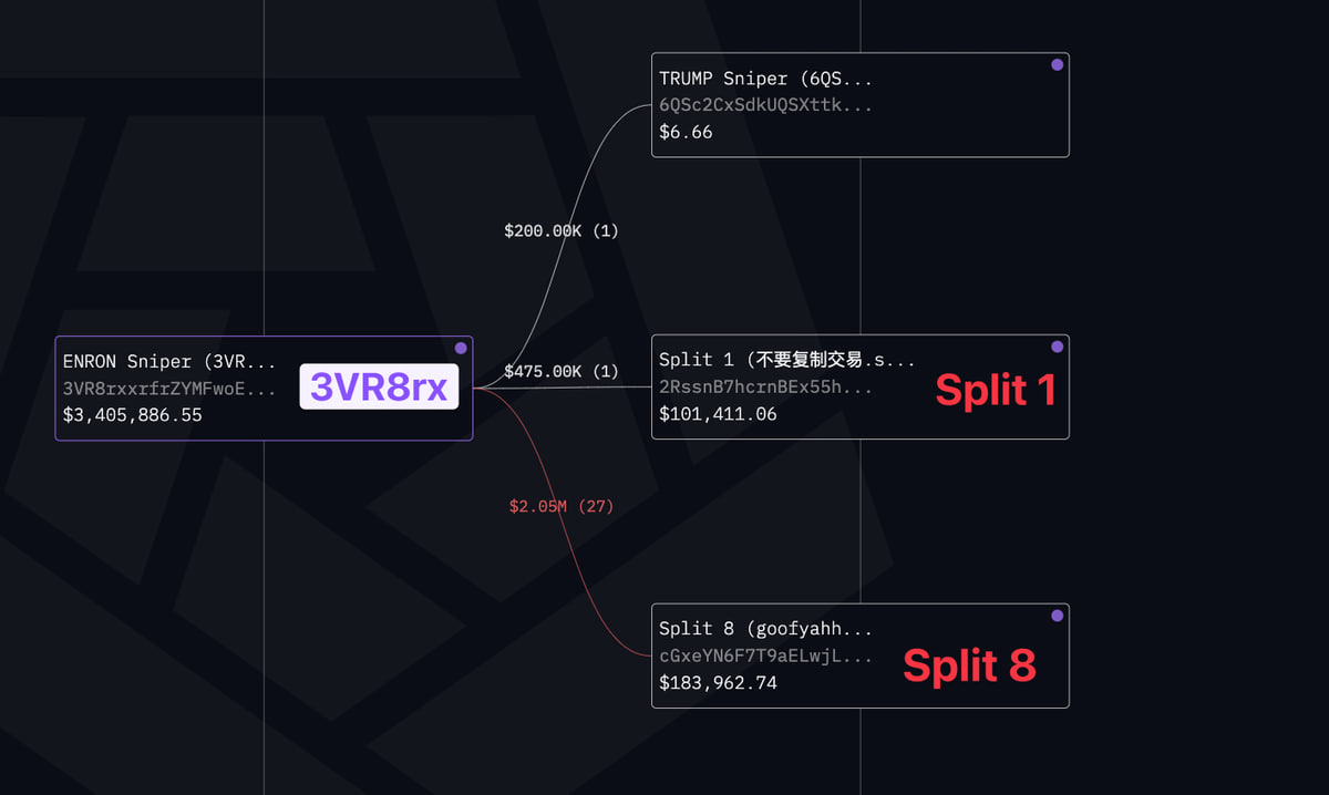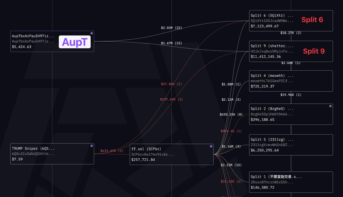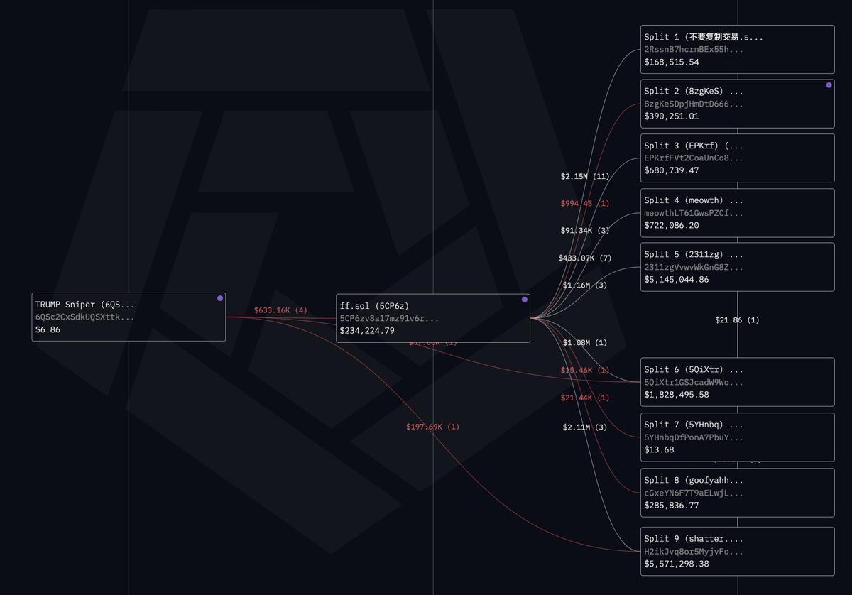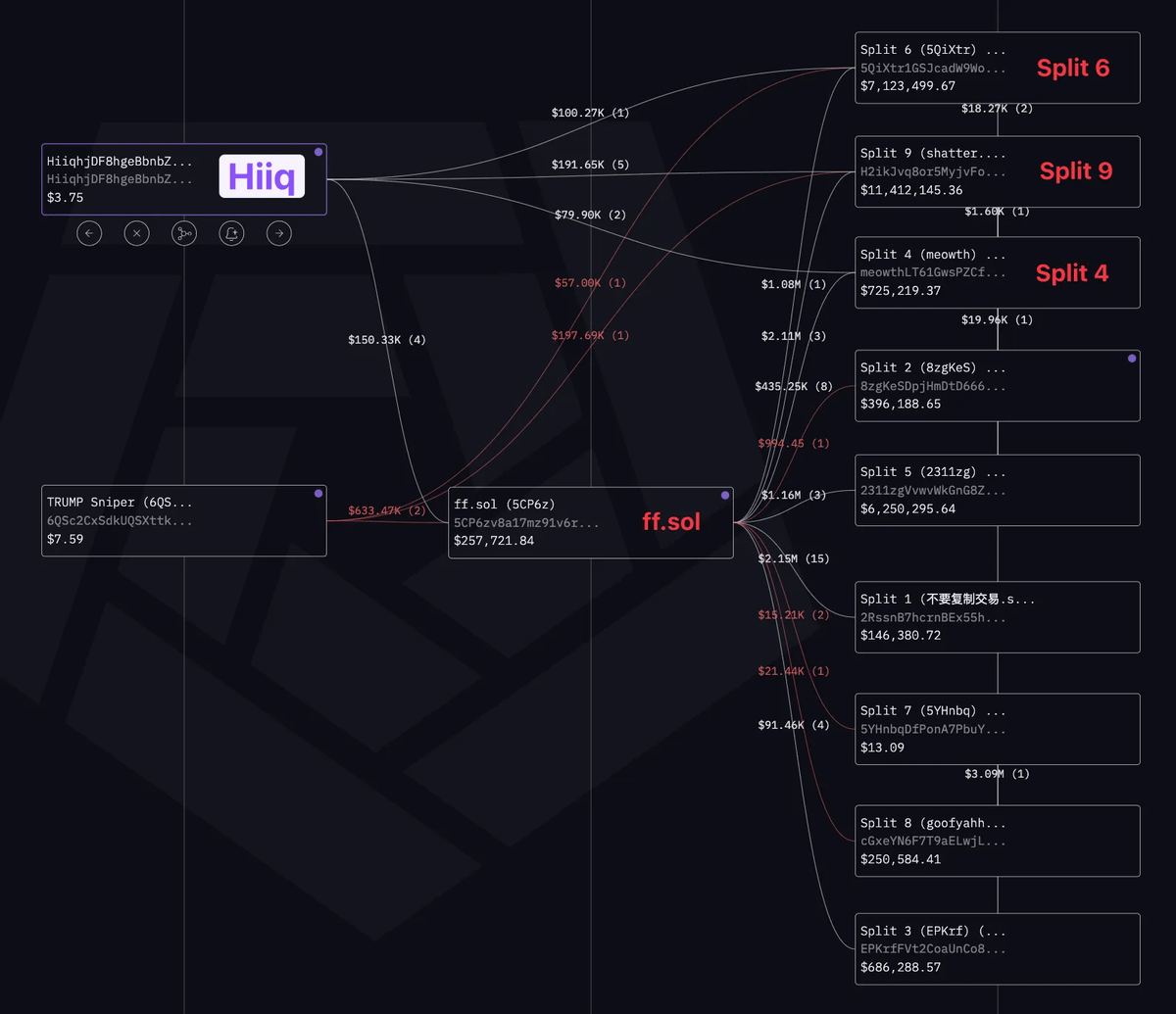 3/ After sniping $TRUMP, the tokens moved from 6QSc2 to FF.sol, which then split them across nine key addresses—Split 1 to Split 9