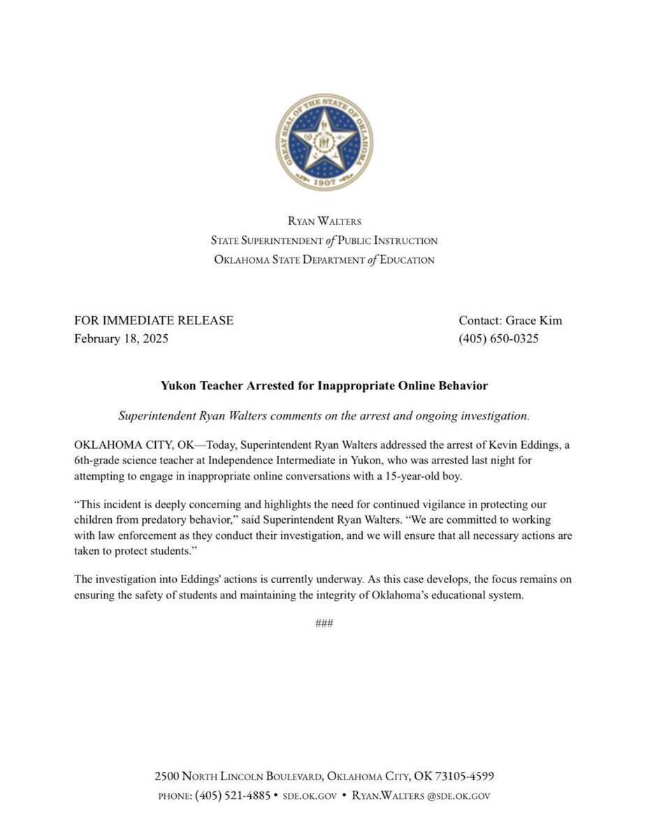 I shared the shocking moment when Kevin Eddings, a 6th grade teacher in Yukon, OK, was arrested for allegedly having inappropriate conversations with a 15-year-old boy. He denied the accusations when confronted by Oklahoma Predator Prevention. State Superintendent Ryan Walters is collaborating with police on the investigation.
