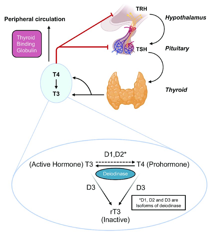 Hypothalamus is a master regulator which releases TRH—which instructs pituitary gland to release TSH (thyroid-stimulating hormone).