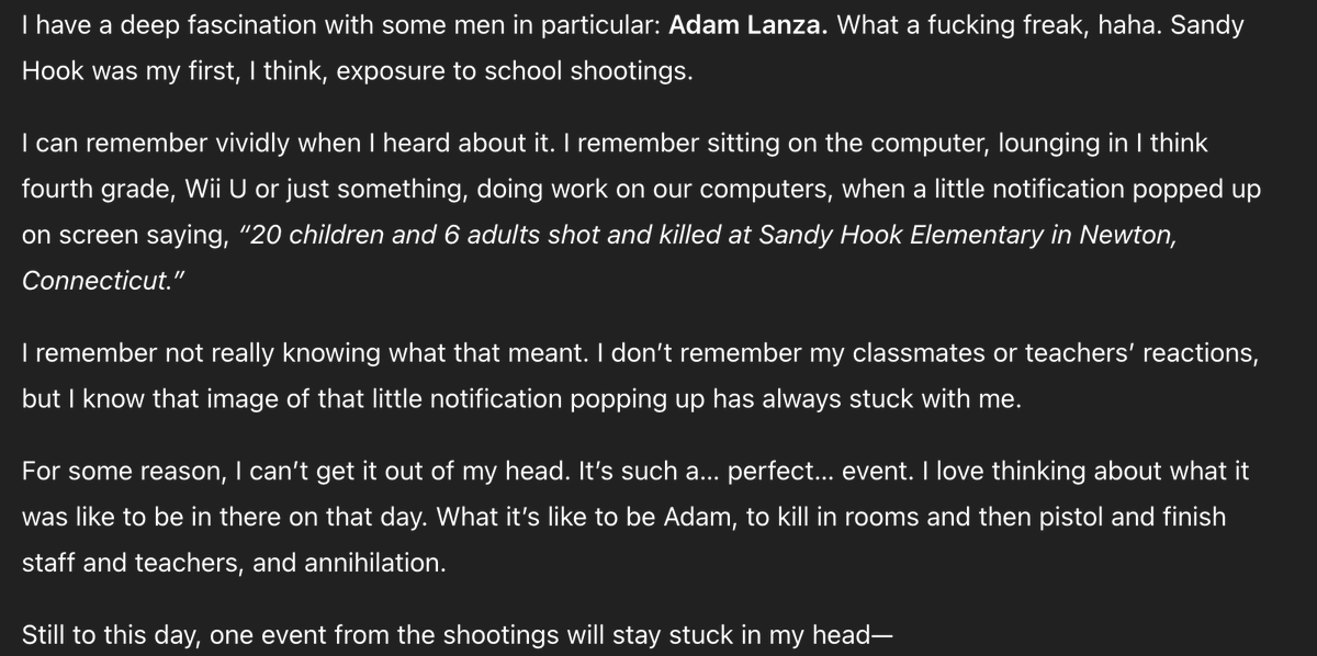 This page demonstrates a direct fixation on Adam Lanza and Sandy Hook, which appears to be the origin point of their obsession with school shootings. https://t.co/siEPIj7Ajw